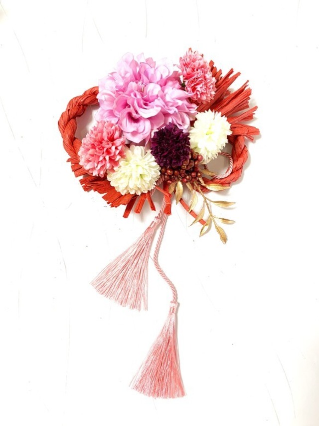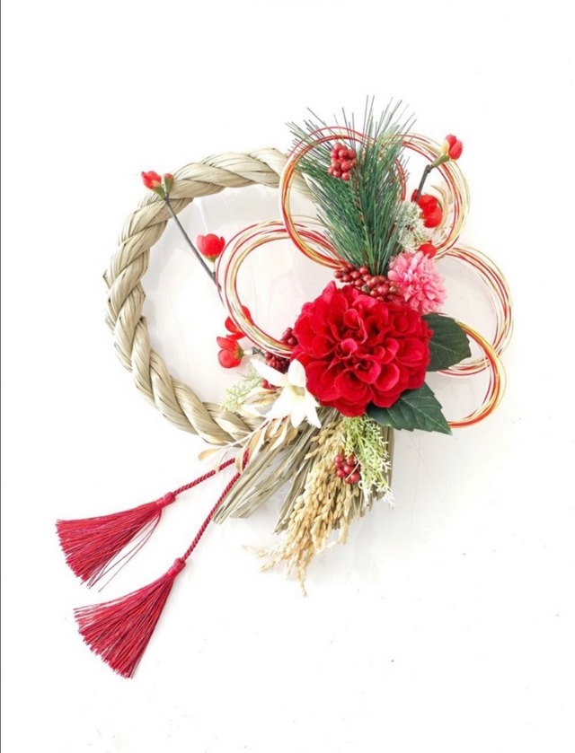 皆様の幸せと健やかな日々 そして 希望と喜びに満ちた幸せな一年をお祈りさせて頂きます*・゜゚・*:.。..。.:*・ .。.:*・゜゚・* 日本では、年始に各家庭へ年神様と呼ばれる神が訪れ そのお祝いとして家族や友人、大切な方達と新年の挨拶を行うのがしきたりとなっています。 家には新しいしめ縄飾りを飾って年神様をお迎え致しましょう。 素敵なお花たちを使用したオリジナルデザインのお飾りは専属デザイナーが丁寧にお作りしております。 華やで和美人なお花達に 「愛情」「健康」「長寿」「充実」「幸せ」「平和」と沢山の想いを込めてデザインしました*・゜゚・*:.*:.。. .。.:*・゜゚・* サイズ 約 25センチ ご自宅用に 大切な方へのプレゼントやお歳暮に如何でしょうか*・゜゚・*:.。..。.:**:.。. .。.:*・゜゚・* 大切に丁寧に制作させて頂きますが 写真の写り方やアーティフィシャルフラワーのサイズ等、多少大きさの違いや季節物のため、花材が少し変わる事もございますのが、どうか、ご了承下さいませ *・゜゚・*:.。..。.:*・*・゜゚・* 全て繊細な花材のため発送中、 リーフ等とれてしまう場合がございますが わずかな場合はご自宅にございますボンド等でご対応くださいます方手作り品のため どうかご了承くださいますと幸いです。 皆様のもとへ癒しと幸せのお花が届きますように*・゜゚・*:.。..。.:* .。.:*・゜゚・*