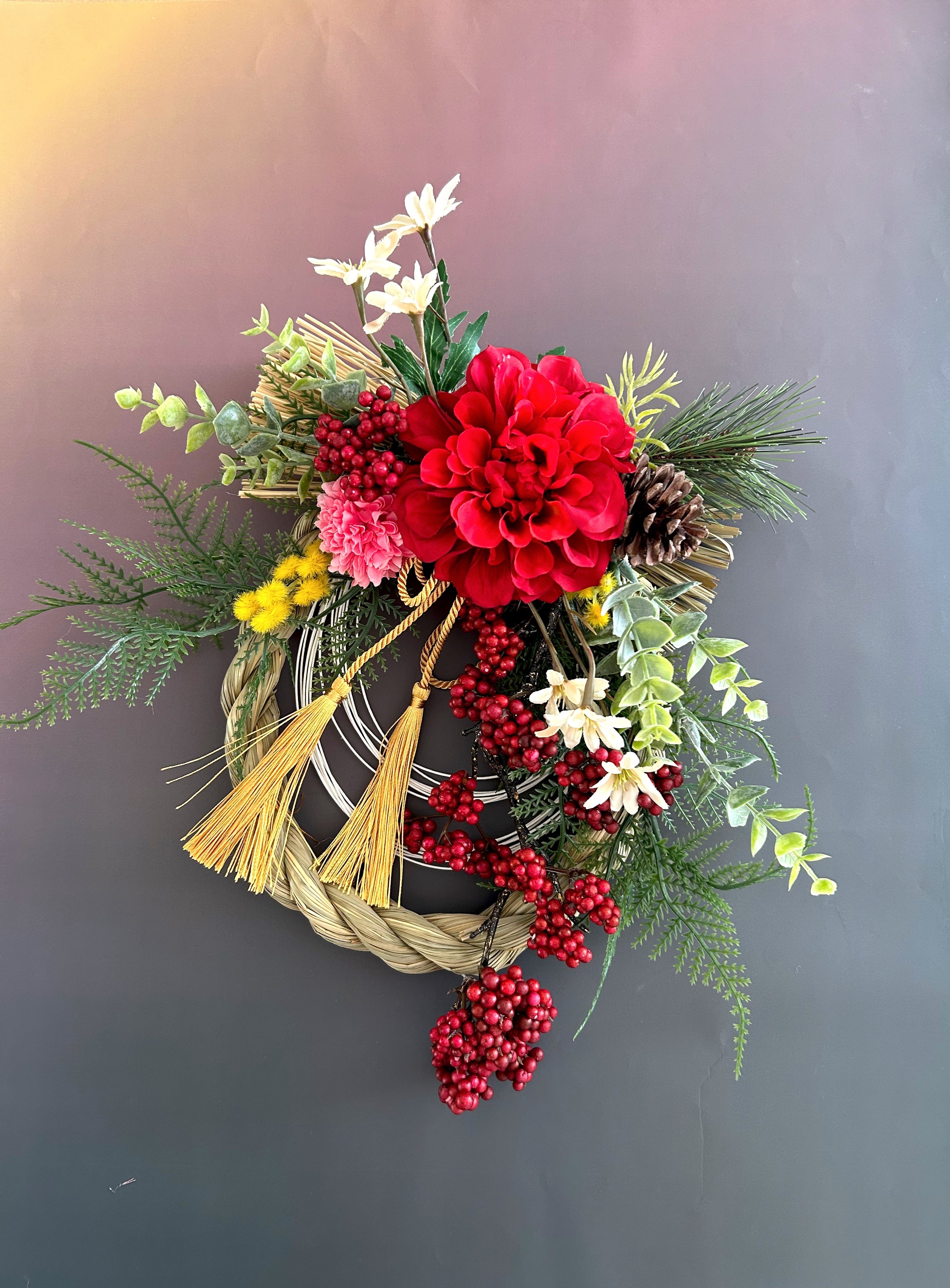 特別価格*お正月飾り*新年を祝う赤ダリアの華やかなお正月しめ飾り*無料ラッピングあり