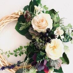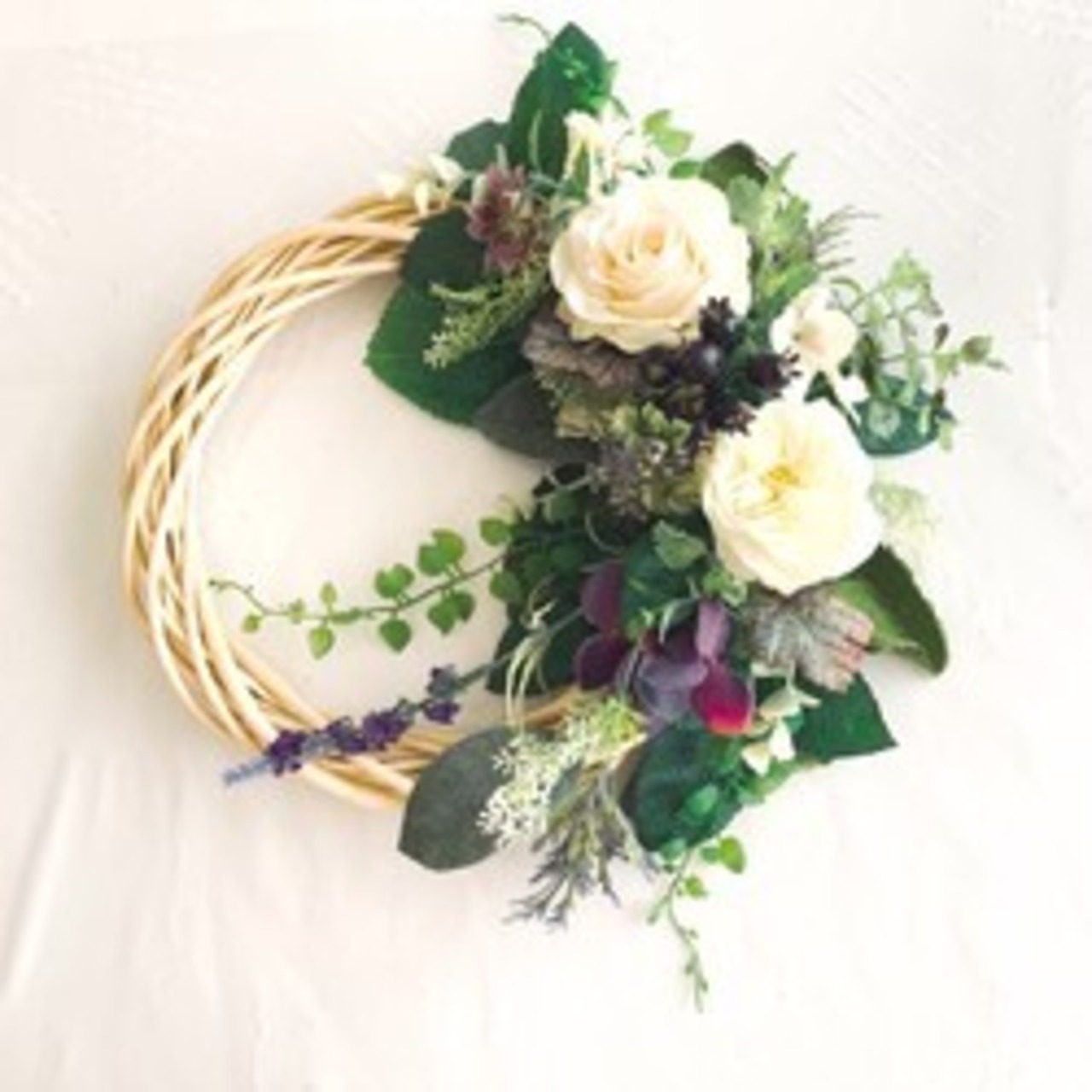 高級アーティフィシャルフラワーを沢山使用し癒しの空間の彩りにリースをデザインしました。