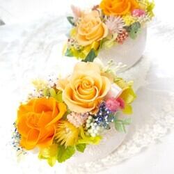 楕円形のレース模様の素敵な磁気にプリザーブドフラワーと繊細なお花を詰めて花摘みアレンジギフトに。