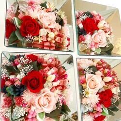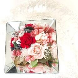 豪華な四面ミラーの綺麗なフレームにプリザーブドフラワーをアレンジしました。四方にお花が映り豪華なアレンジはギフトとしてとても華やかです。