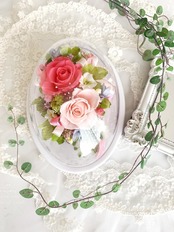 コロンと楕円のドーム型の器に優しいブライダルピンクのお色味のプリザーブドローズと繊細なプリザーブドフラワーのかすみ草等、アーティフィシャルグリーン花材を添えて。