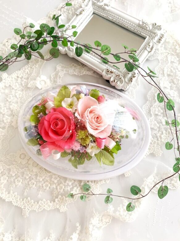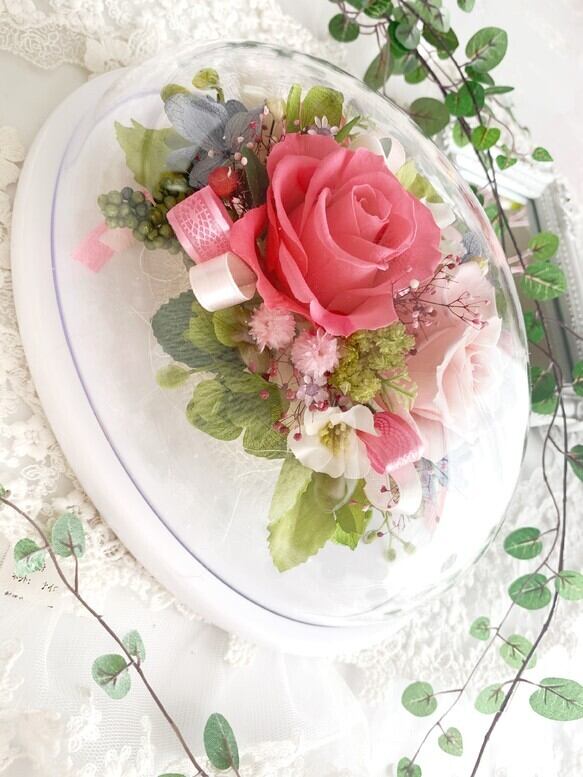 プラスティック製品のため、軽くて扱いやすくドーム形の蓋が付いているため、埃も気にせずに飾れ、永くプリザーブドフラワーがお楽しみ頂けます。