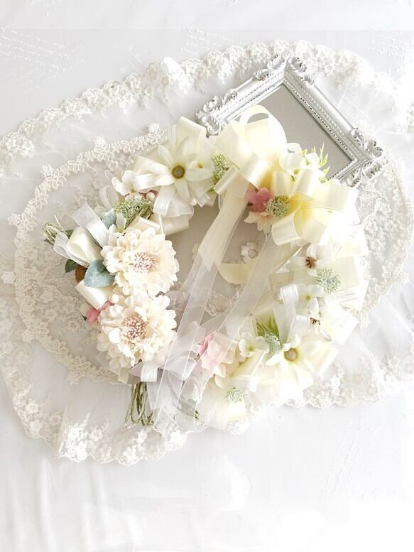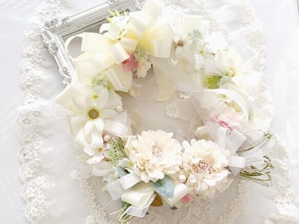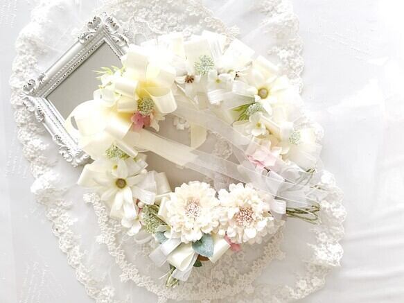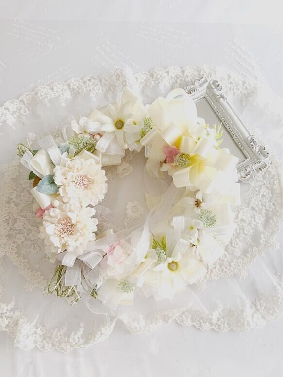 結婚祝い*白いお花とふんわりリボンの癒しリース