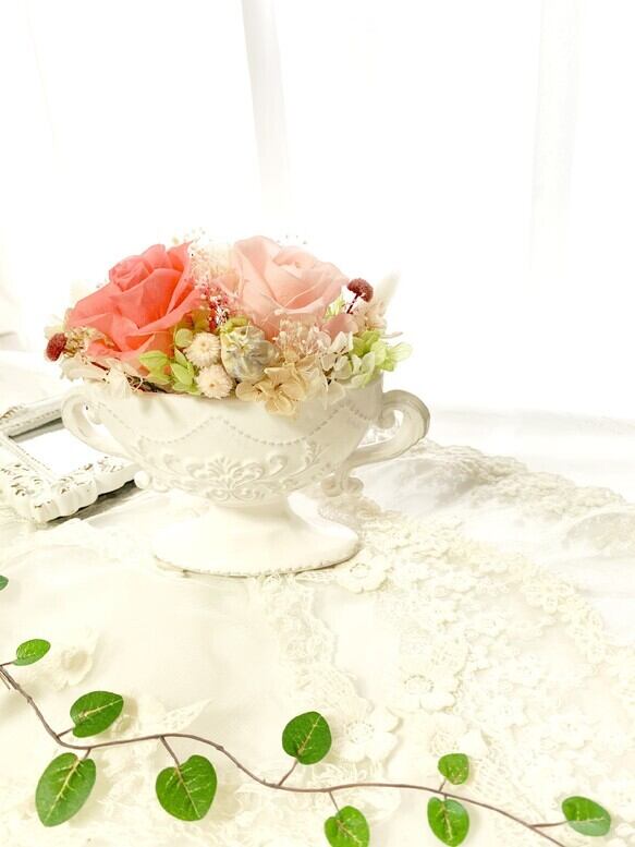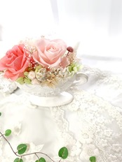 結婚式*お洒落なドレス陶器に可愛いピンクのプリザーブドフラワーアレンジ