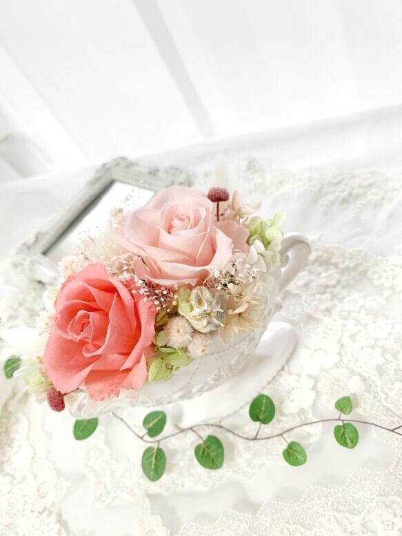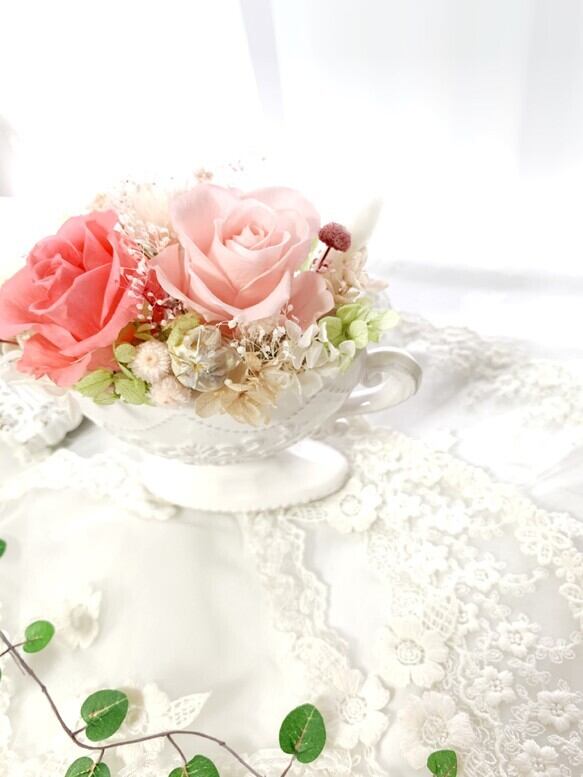 可愛い取手付きの陶器の器はまるでドレスを広げているような可愛いフォルム。人気のパステルとキュートなプリザーブドピンクローズとプリザーブド加工された繊細な花材と綺麗なアーティフィシャルフラワーで丁寧にアレンジしました。