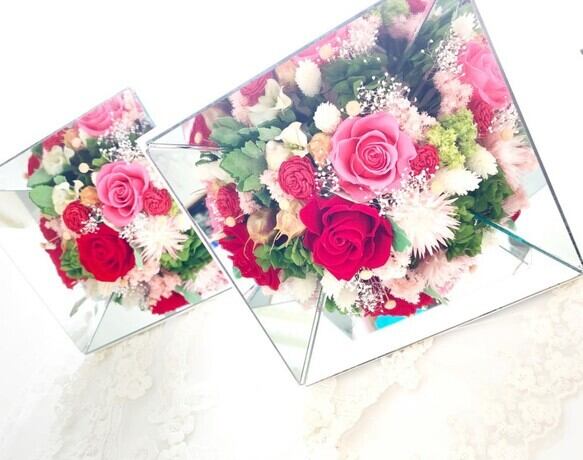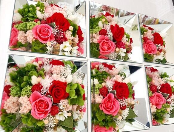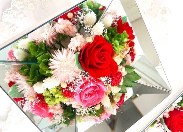 豪華な四面ミラーの綺麗なフレームにプリザーブドフラワーをアレンジしました。四方にお花が映り豪華なアレンジはギフトとしてとても華やかです。