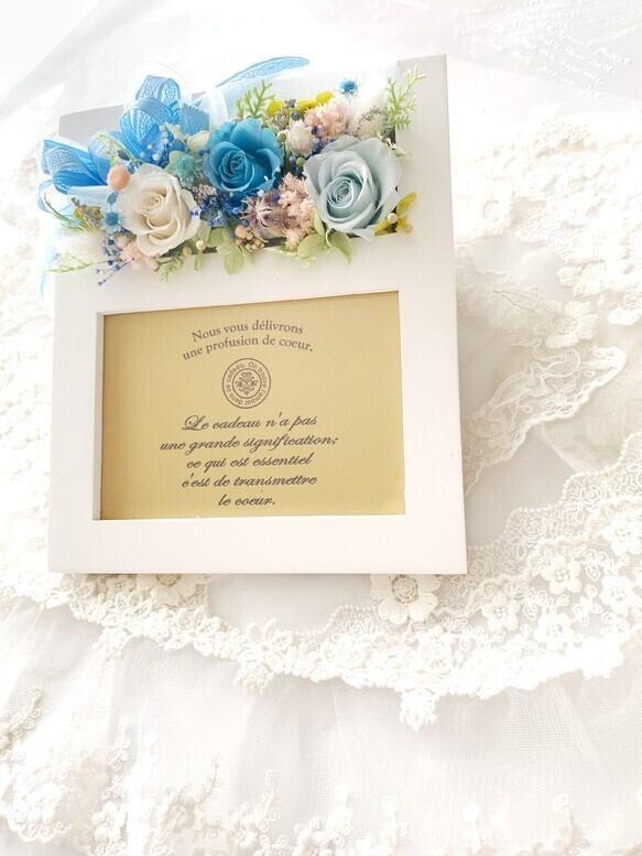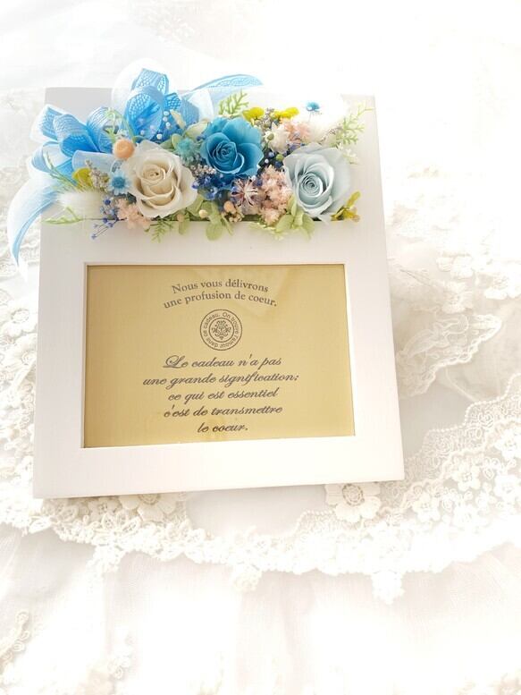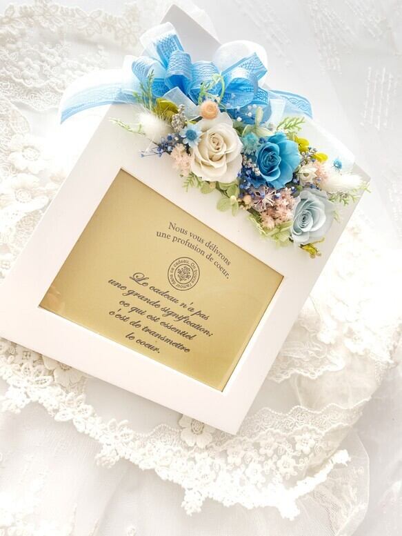 平和と安らぎのブルーのプリザーブドフラワーを散りばめたフォトフレームに沢山の笑顔の写真を入れて飾って欲しい...と願いを込めました。