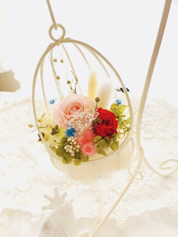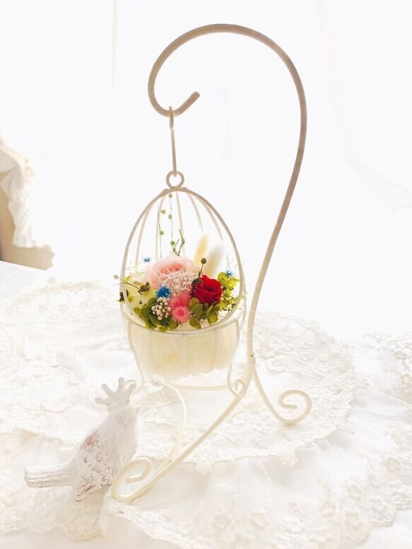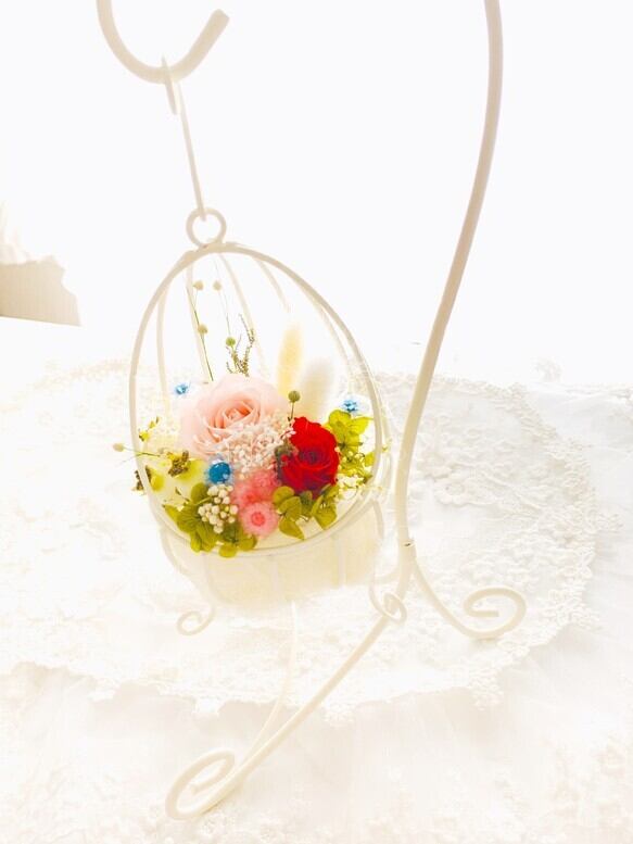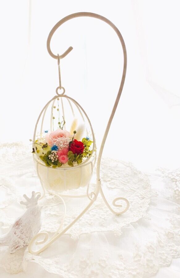 可愛い卵形アイアンの器にスタンド付きのプリザーブドフラワーをアレンジしました。