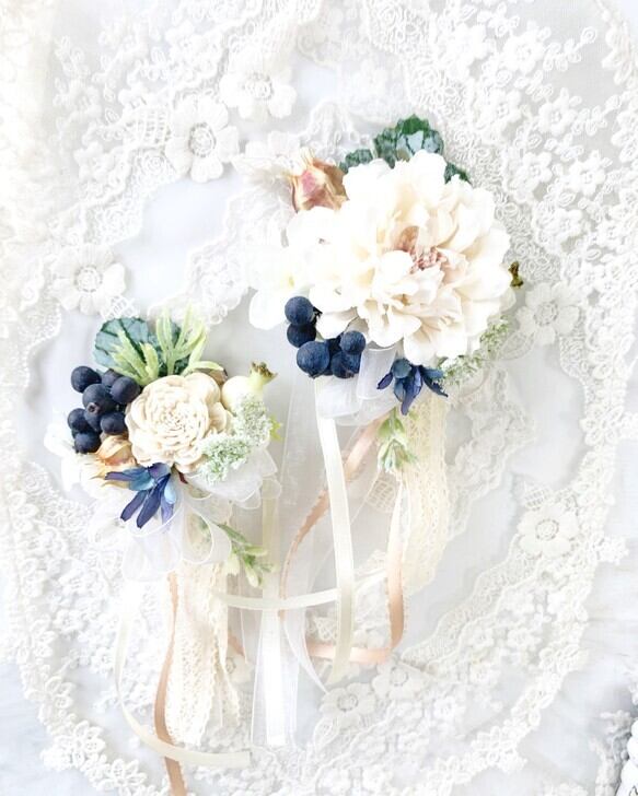アンティークリボンとルナリボン、サテンとオーガンジーをヒラヒラと添えてお揃いのコサージュをデザインしました.。.:*・・*:.。. .。.:*・゜゜・*