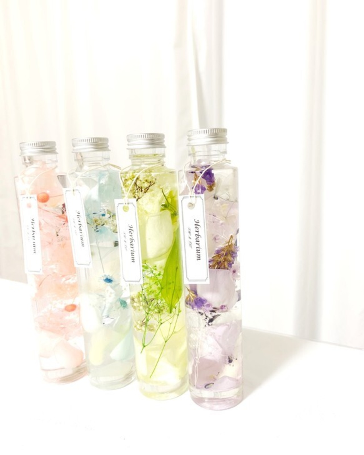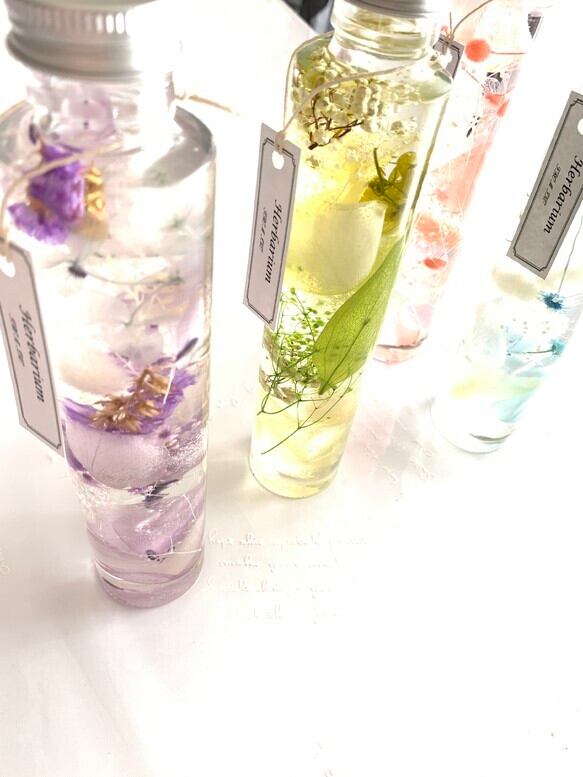 お花が揺れる神秘的な世界。瓶を傾けると小さな気泡が流れキラキラしてとても素敵です・*:.。..。.:*・