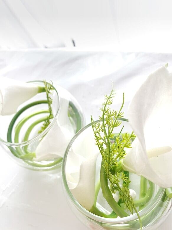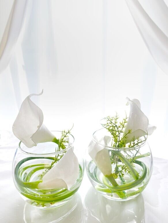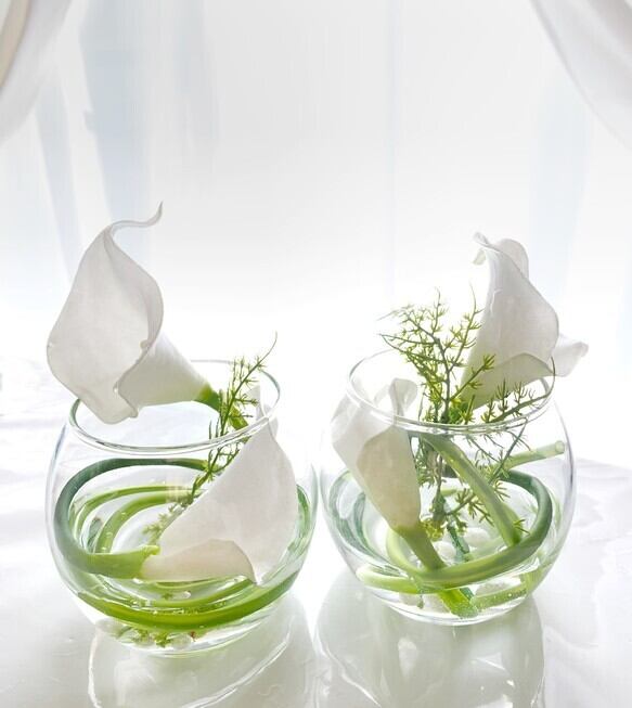 丸いフォルムのガラス花器に高級アーティフィシャルフラワーのカラーを添えて。