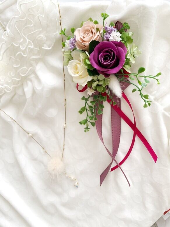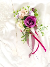 モーヴピンク、シャンパン、ブルゴーニュお洒落な3色のプリザーブドフラワーコサージュ