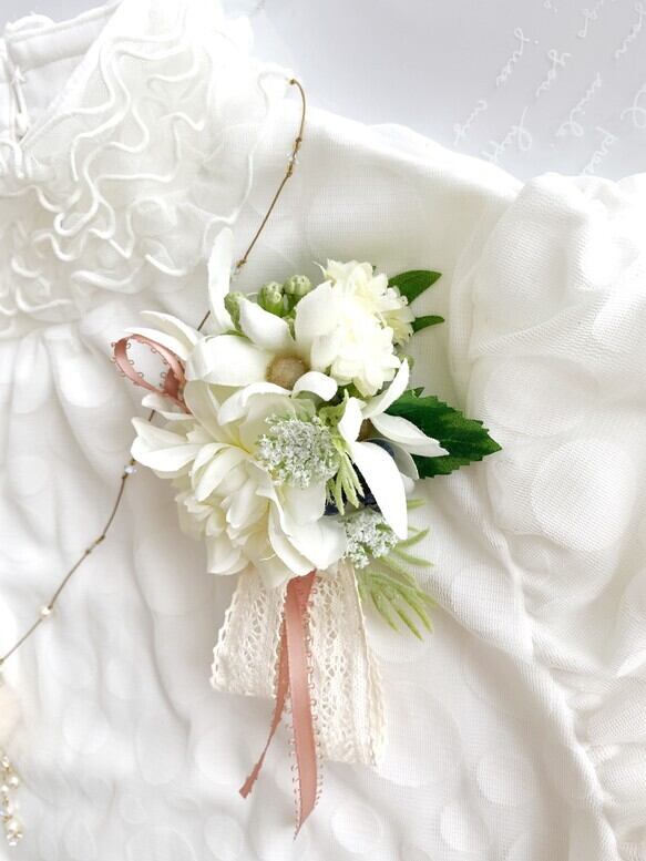 ルナリボンとフランネルフラワーのフェミニンなコサージュ