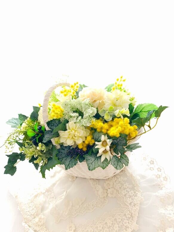 繊細な色味の高級アーティフィシャルフラワーグリーンをふんだんに使い 春を告げるミモザとダリアで幸せなお花をデザインしました゜*:.。..。.:**:.。.。.:*・*:.。. .。.:*・゜゜