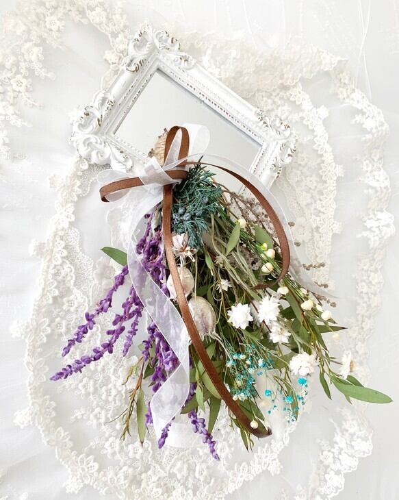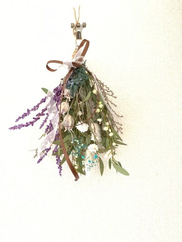 ドライフラワーのユーカリ、アメジストセージ、かすみ草を使用した爽やかなスワッグで香りもお楽しみくださいませ゜゜・*:.。..。.:*・ .。.:*・゜゜・*