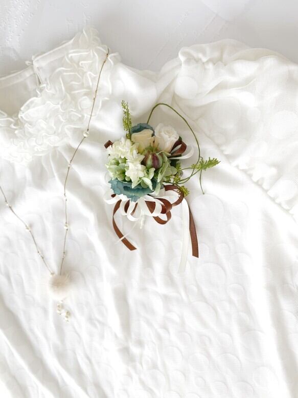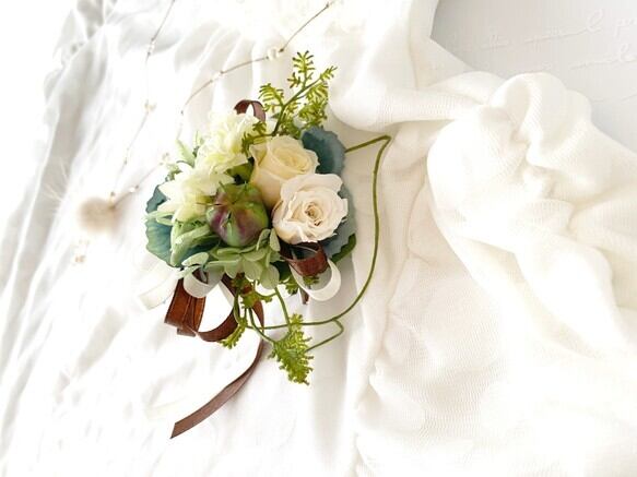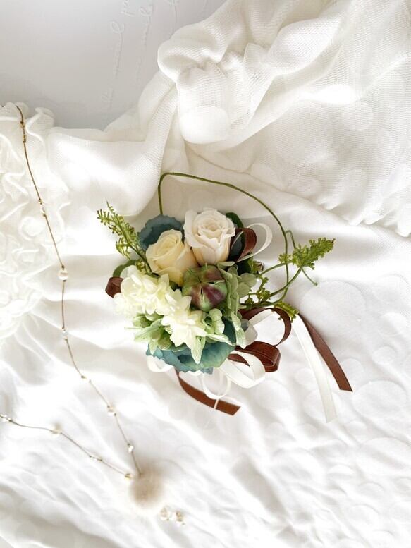 春の新作は ミニプリザーブドフラワー2輪とアーティフィシャルグリーンを束ねたお洒落なコサージュ゜゜・*:.。..。.:*・・*:.。. .。.:*・゜゜・*