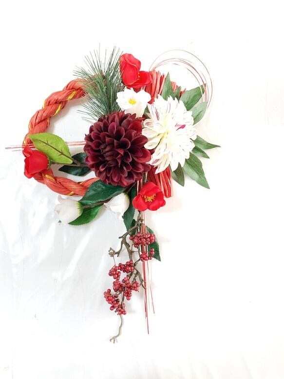 新年のお正月しめ縄飾り*紅白祝いダリアとダブル椿のお飾り