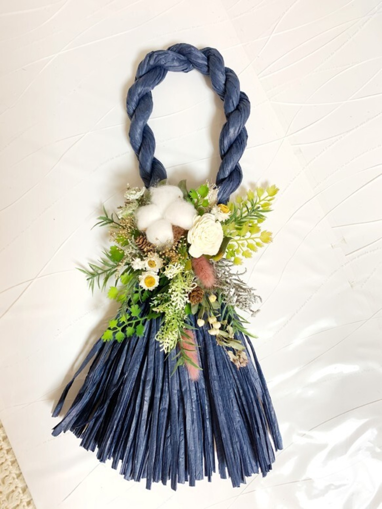 2022お正月ハンドメイド※人気のネイビー縁起結び綿花とソラローズアーティフィシャルグリーンの新春しめ縄飾り