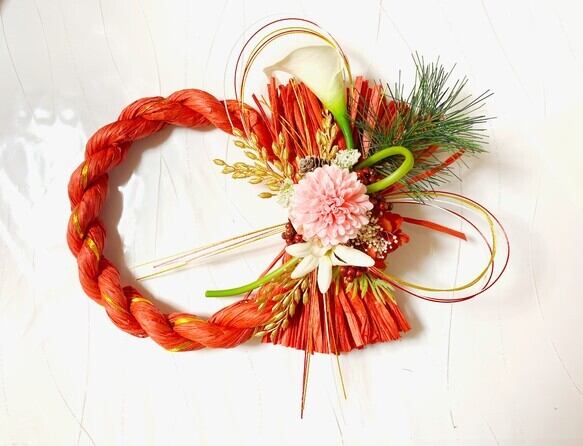 「お正月ハンドメイド2022」 しめ縄飾り*祝朱色しめ縄とマムとカラーのお正月飾り