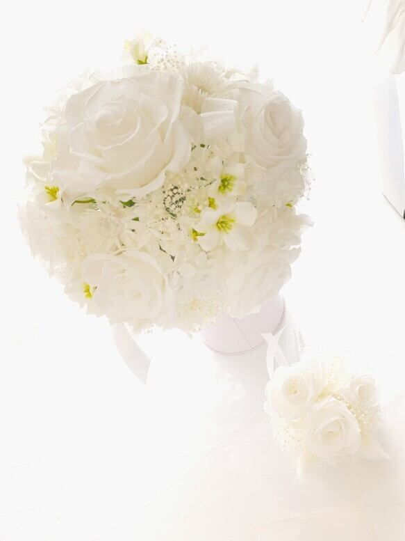 真っ白なウェディングブーケとお揃いのブートニアは iko de' roi 人気商品