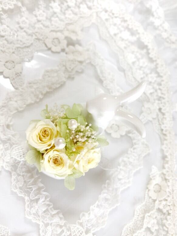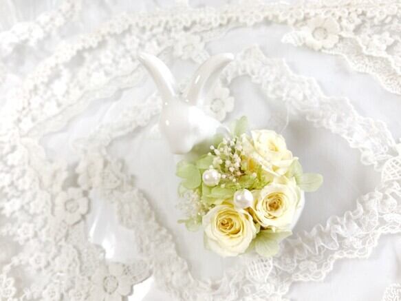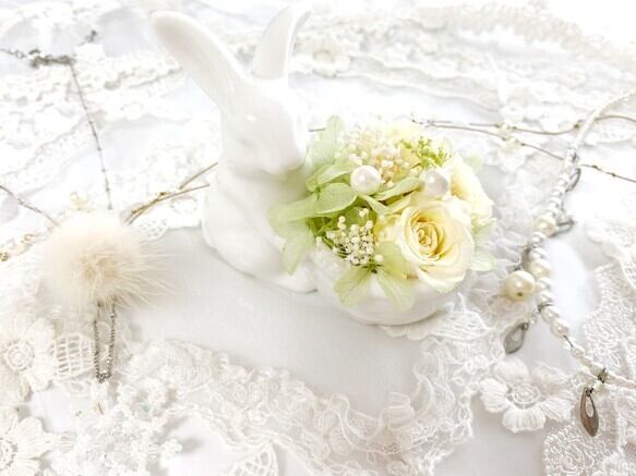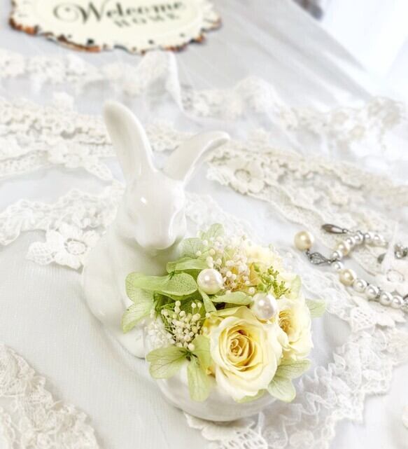 白ウサギの陶器の中にプリザーブドフラワーシャンパンカラーの薔薇と四つ葉をイメージした紫陽花を添えて*:.。..。.:**:.。. .。.:*・゜゚・*