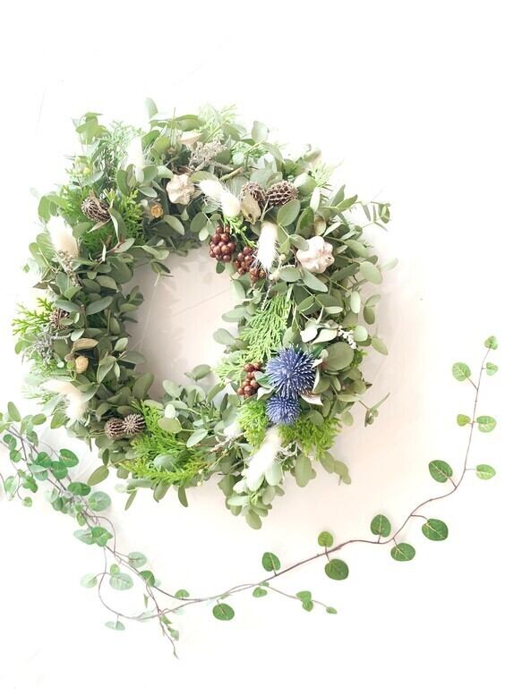 プリザーブドフラワーとアーティフィシャルフラワー生枝のユーカリとヒバを使用したナチュラルリース*:.。..。.:**:.。. .。.:*・゜゚・*