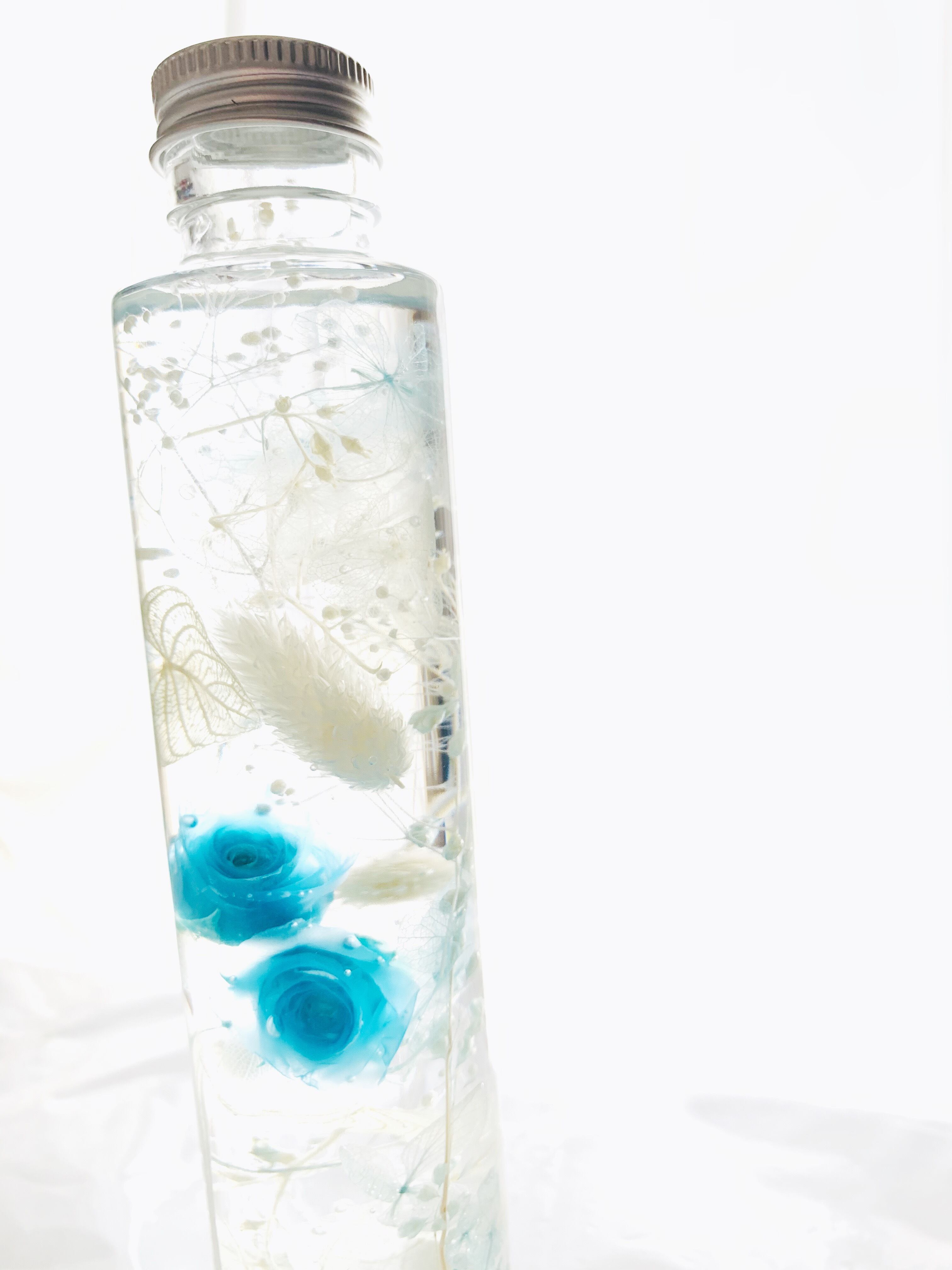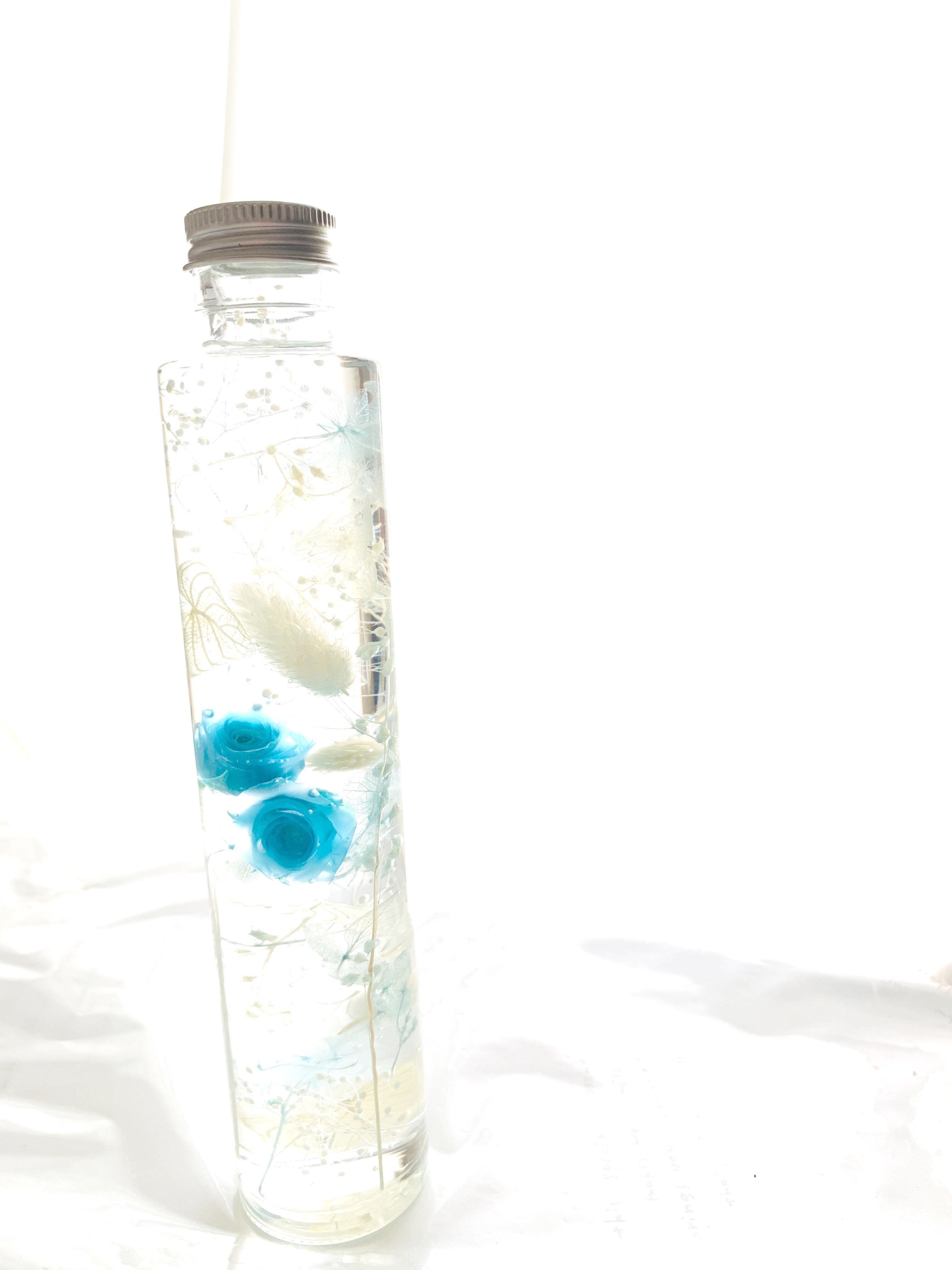 中央にプリザーブドローズ奇跡の花言葉を持つブルーローズを置き透明感溢れるデザインに仕上げました。