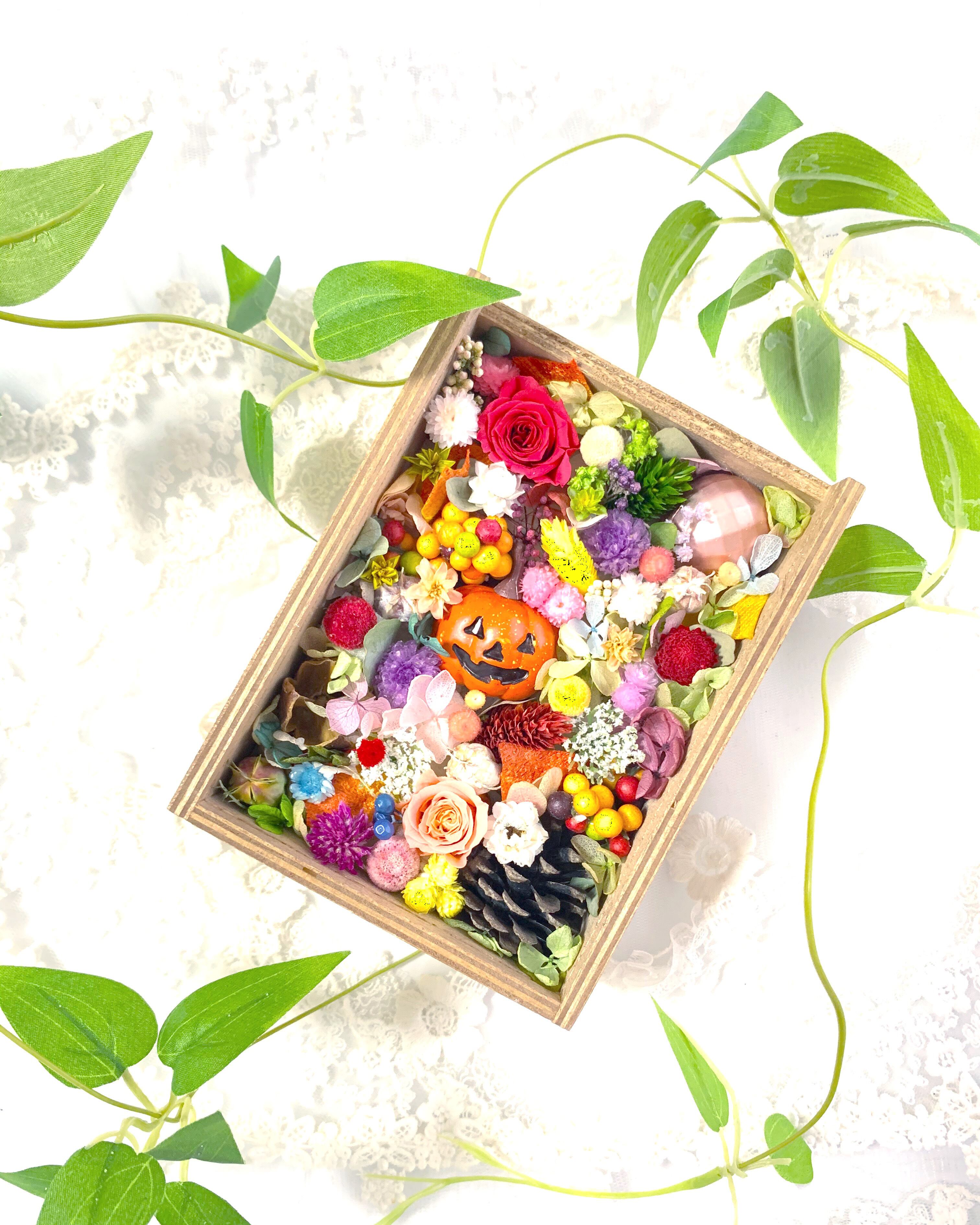 プリザーブドフラワー、ドライフラワー、アーティフィシャルフラワーを丁寧に可愛く詰め込んだジェリービーンズのようなハロウィンアレンジ。