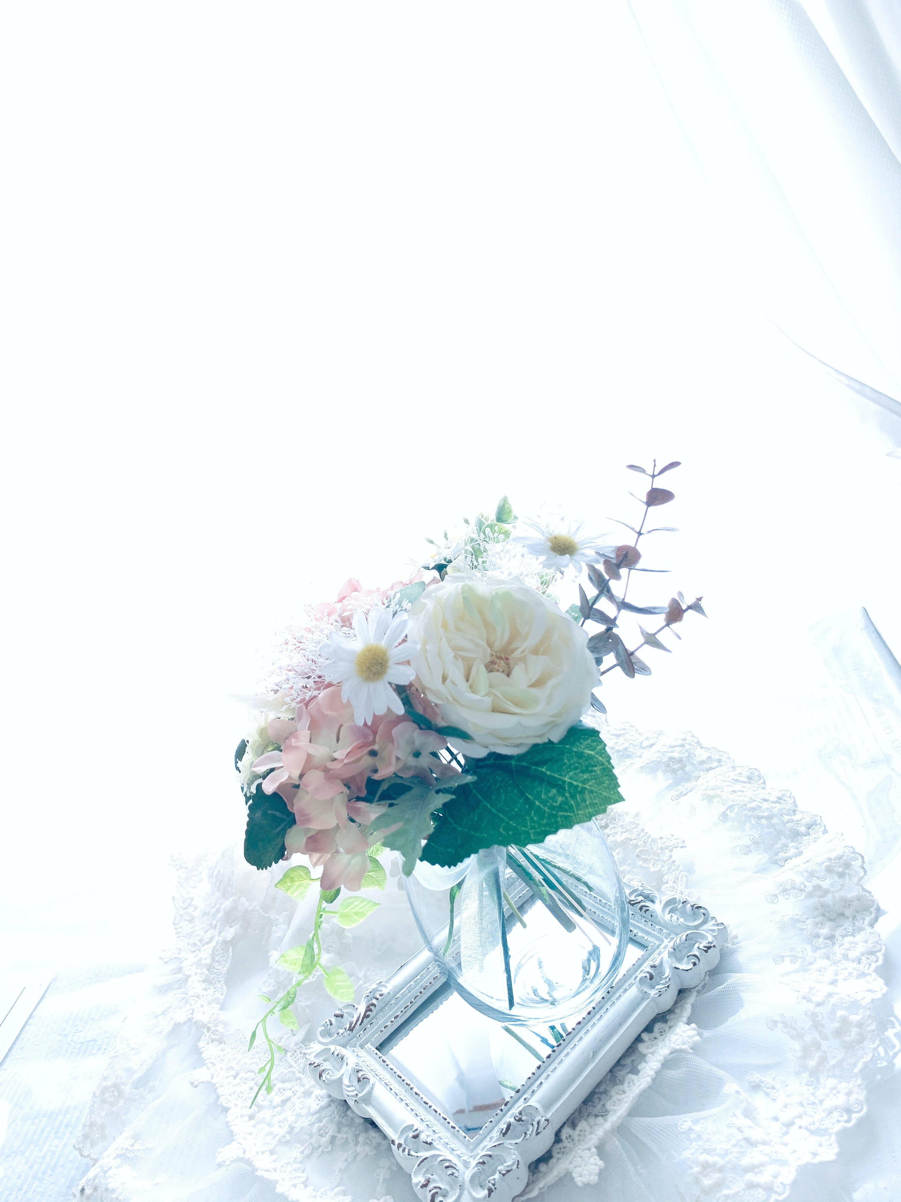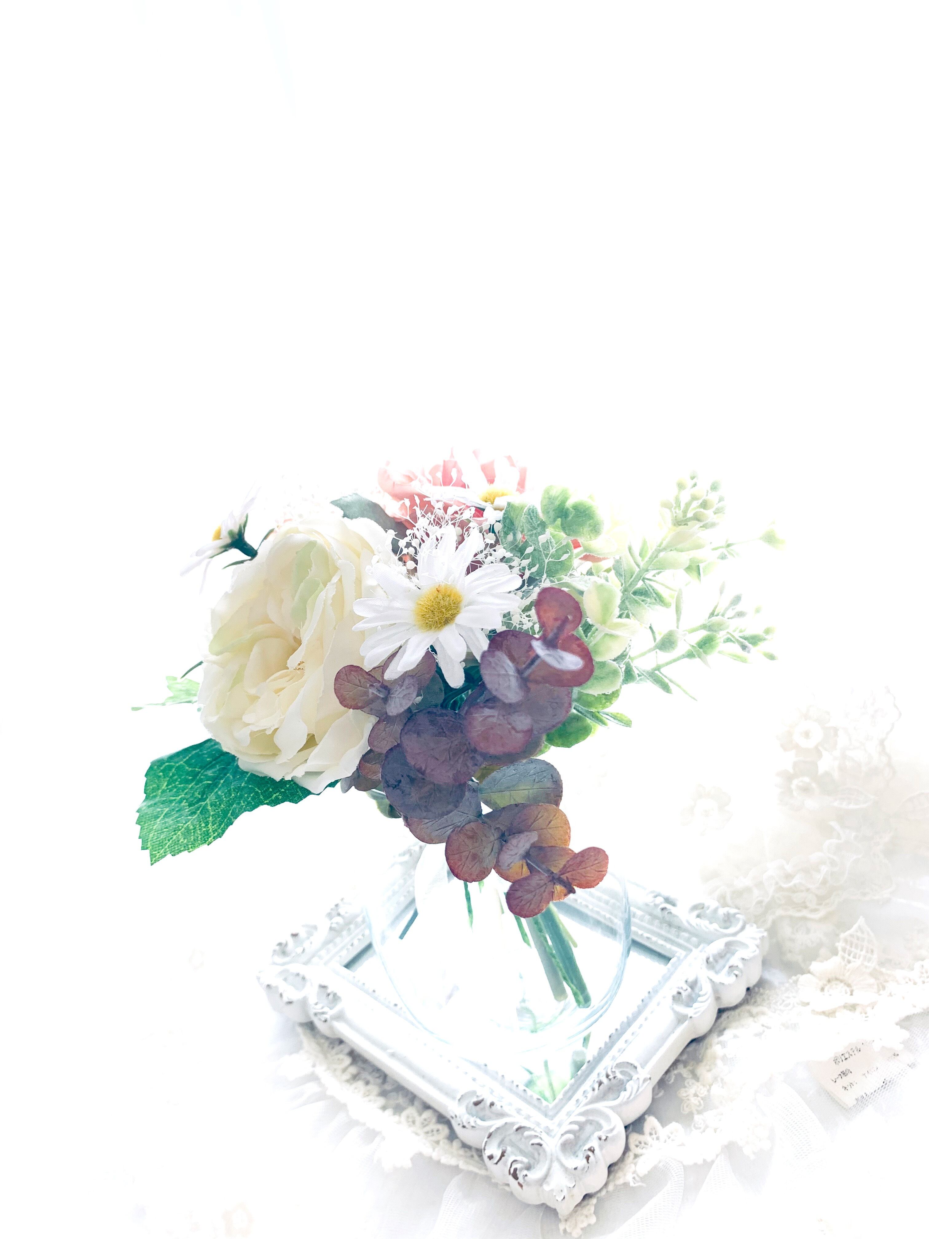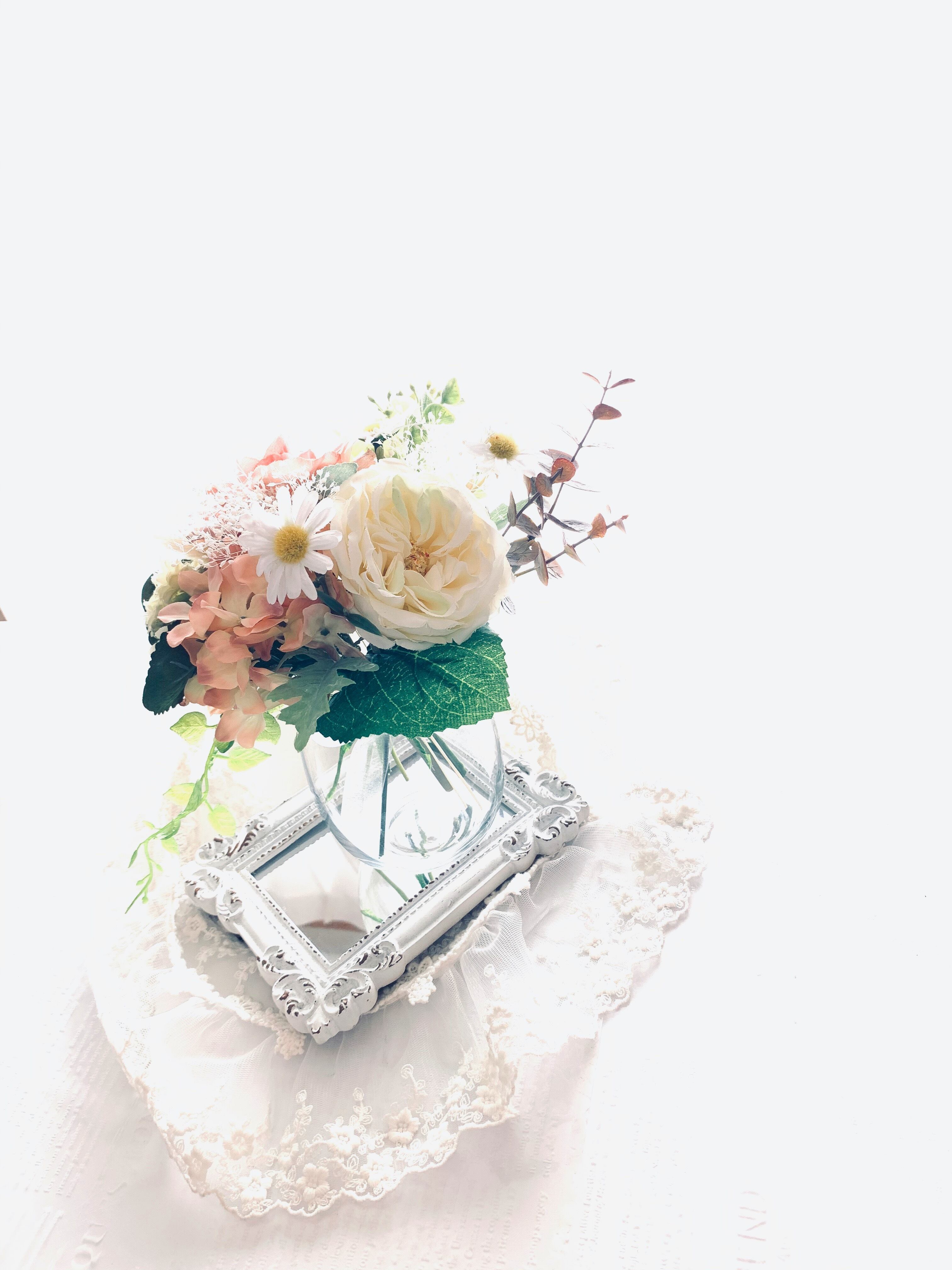 透明グラスにアーティフィシャルフラワーくすみ系ピンクローズとホワイトオールドローズ、可愛い小さなマーガレットやカランコエ、ピンクの紫陽花