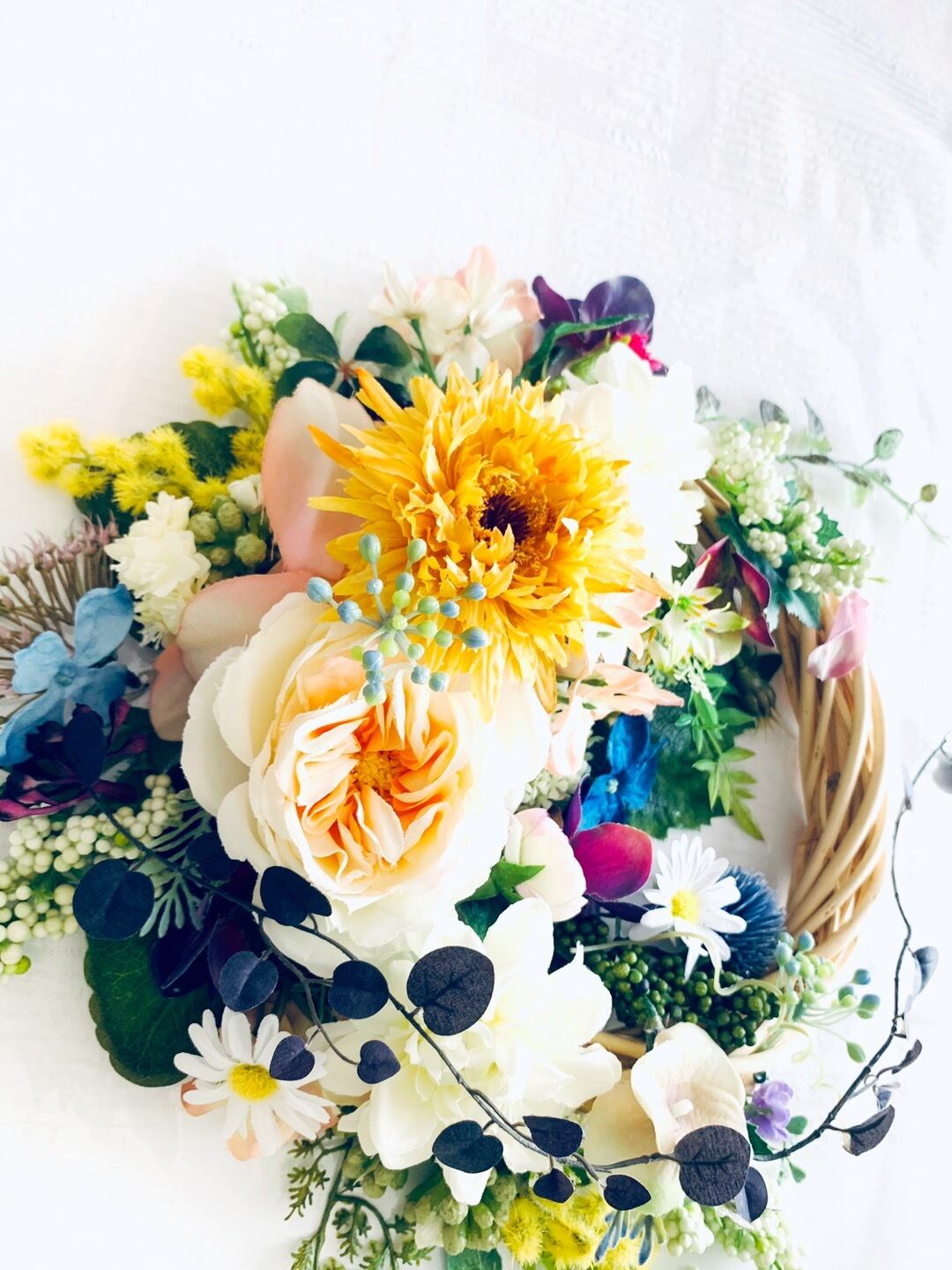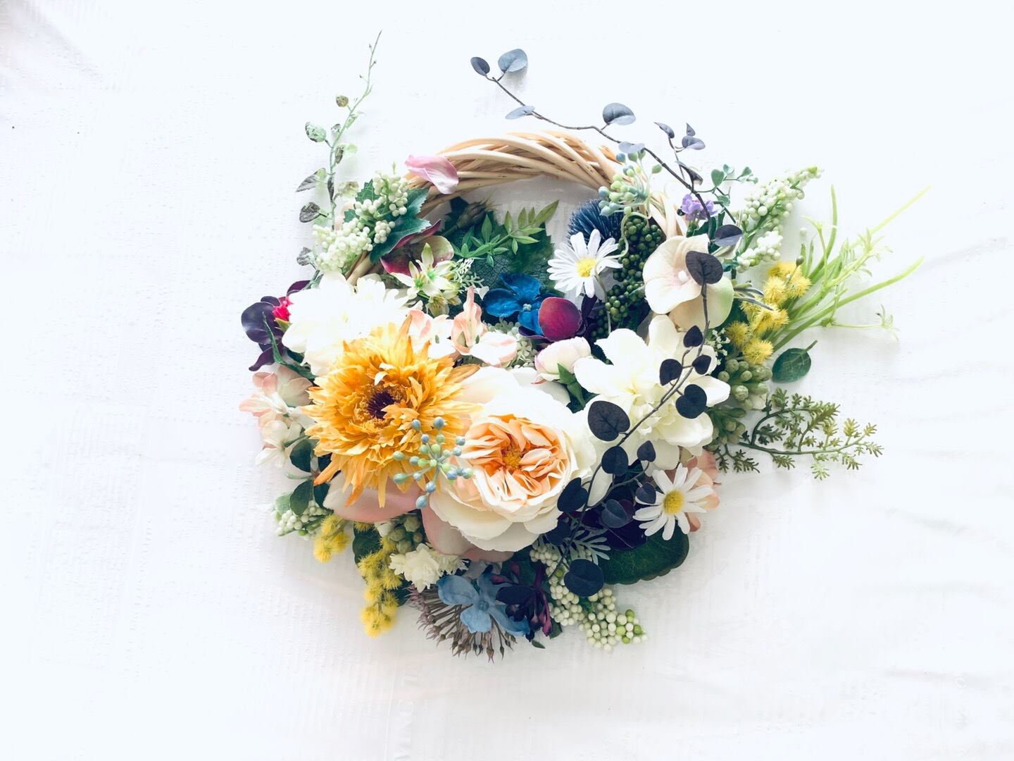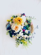 沢山のアーティフィシャルフラワーを使用して自然色なオータムカラーで透明感を出して秋の癒しの空間の彩りにリースをデザインしました。
