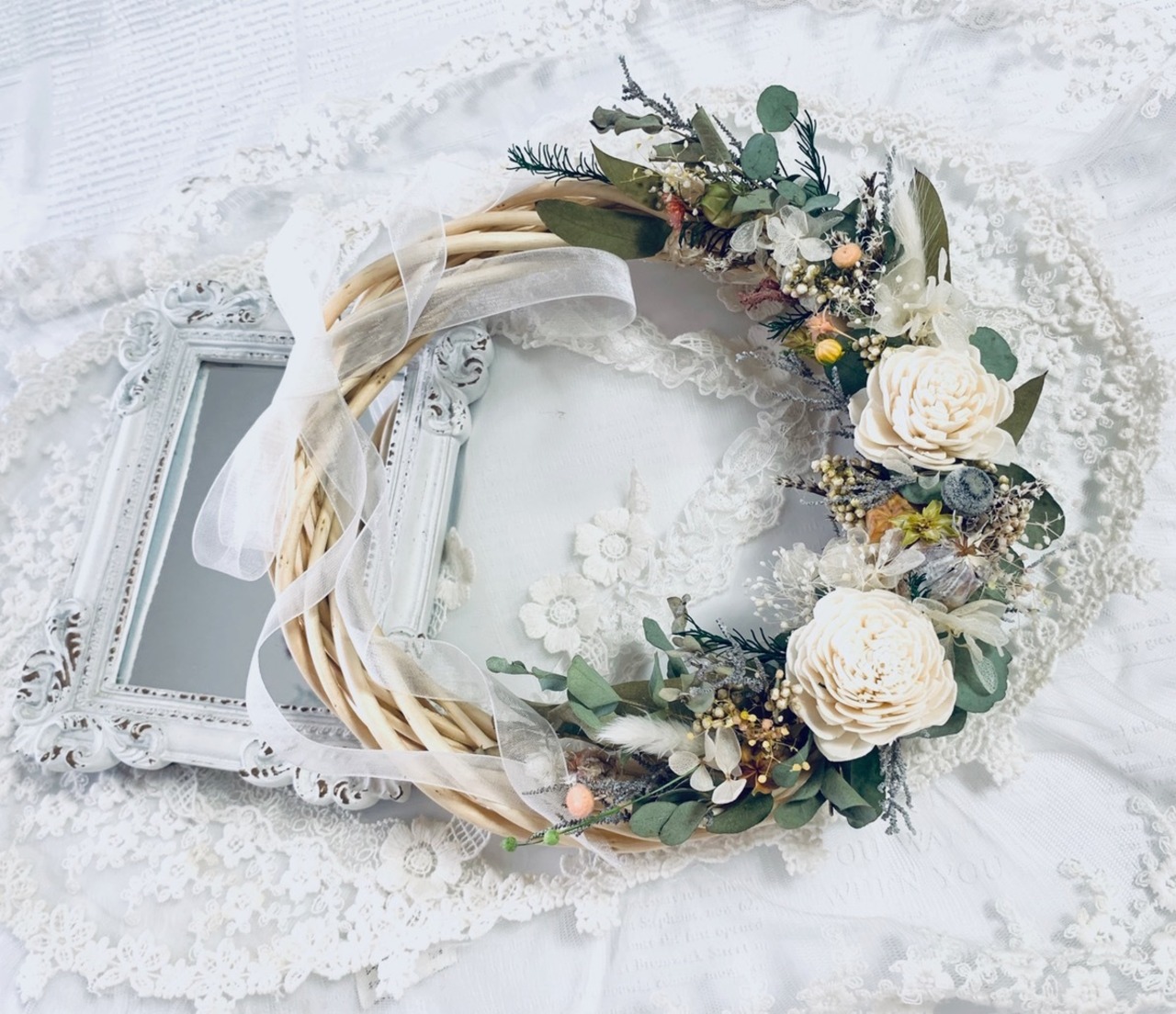 ナチュラルな優しい色合いのお部屋に馴染むドライフラワーリース