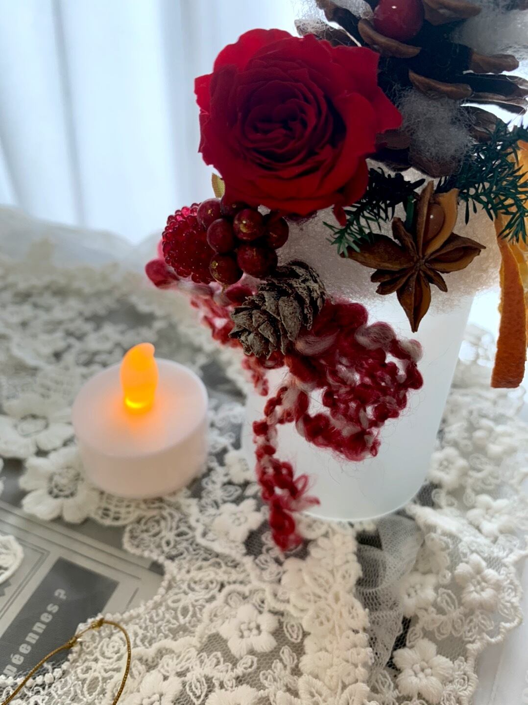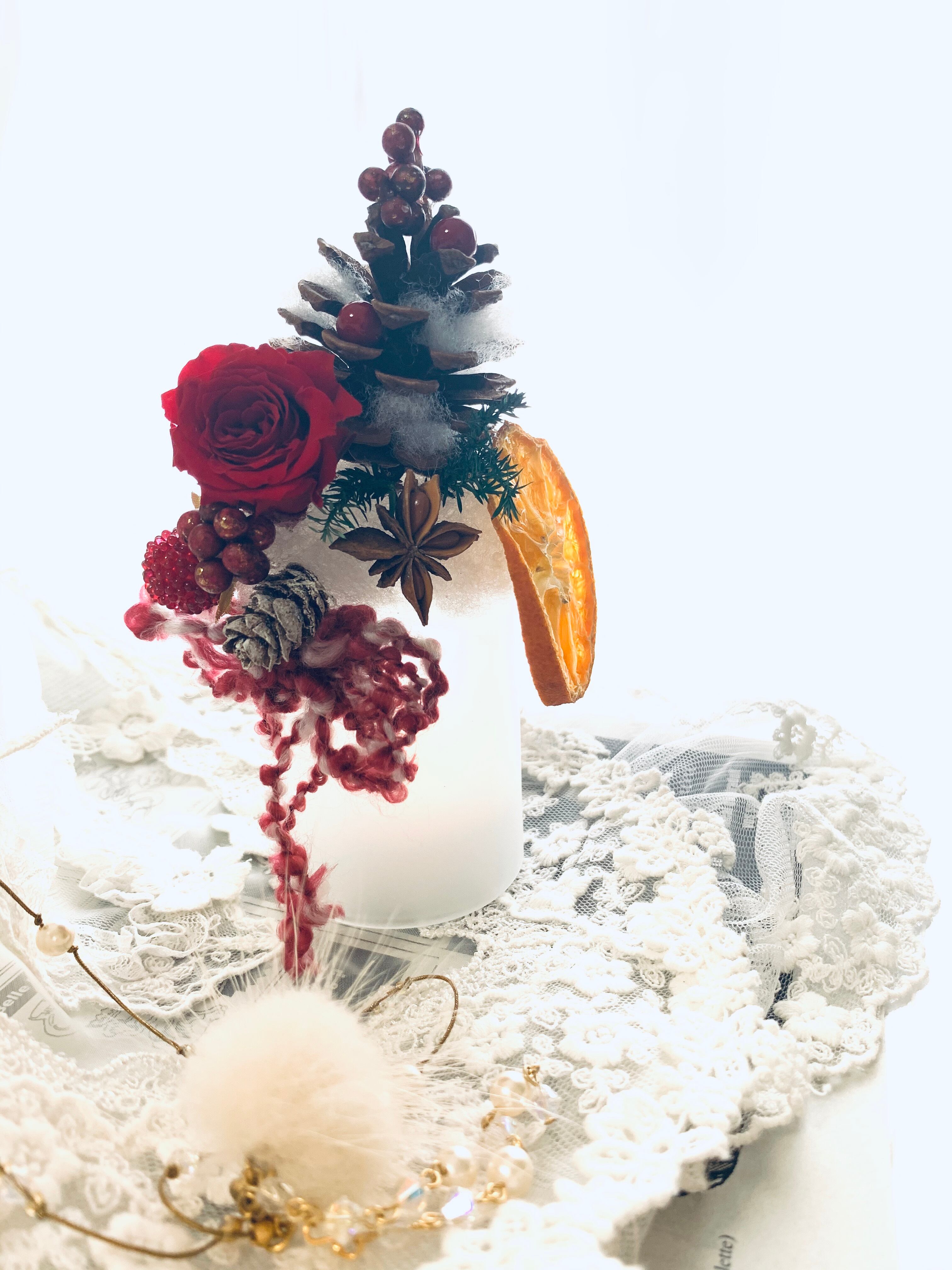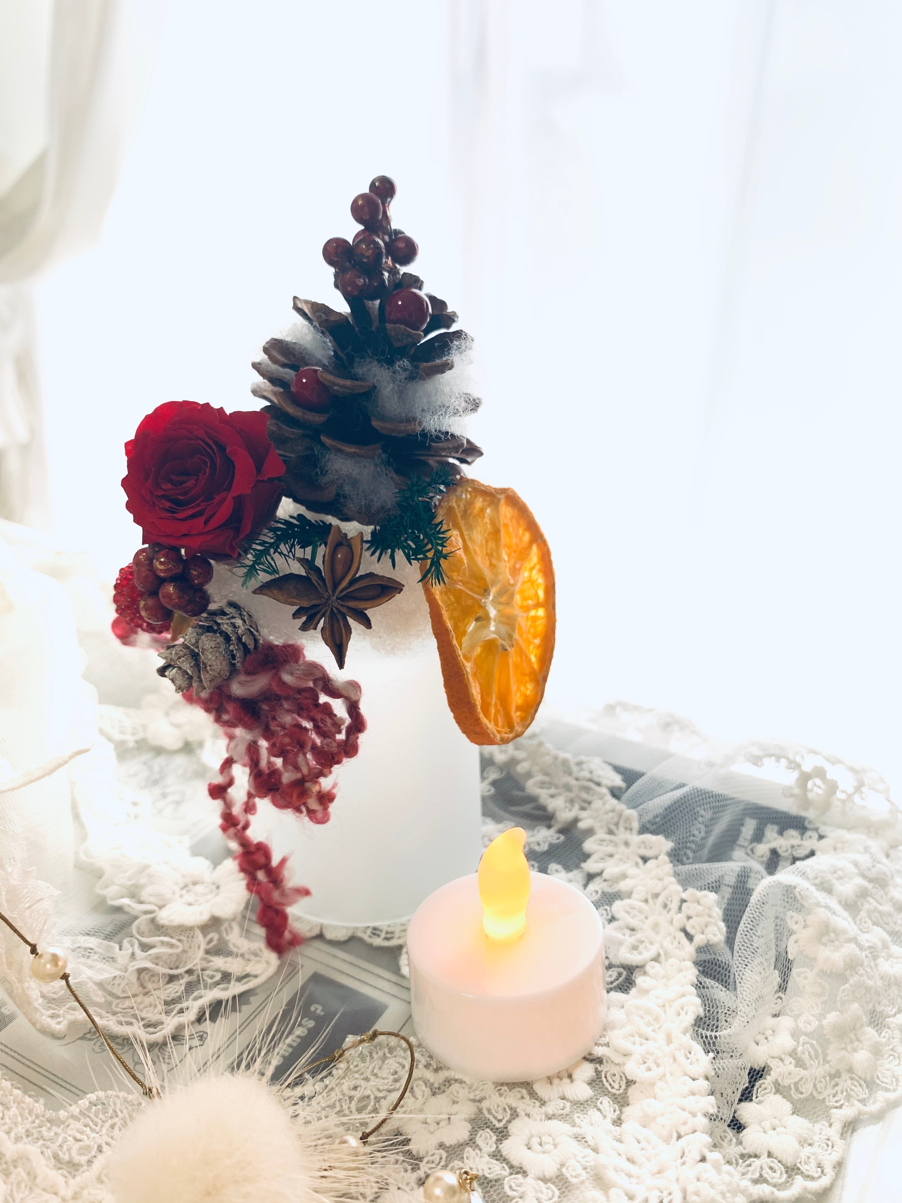 小さなキャンドルが灯るクリスマスアレンジ