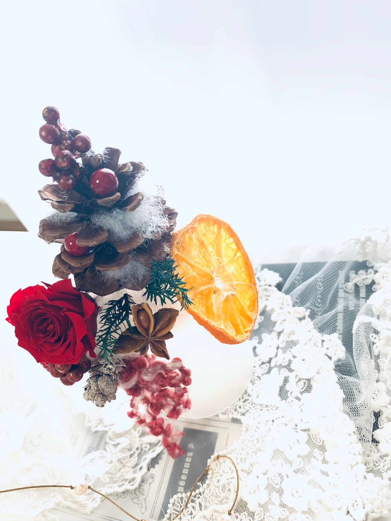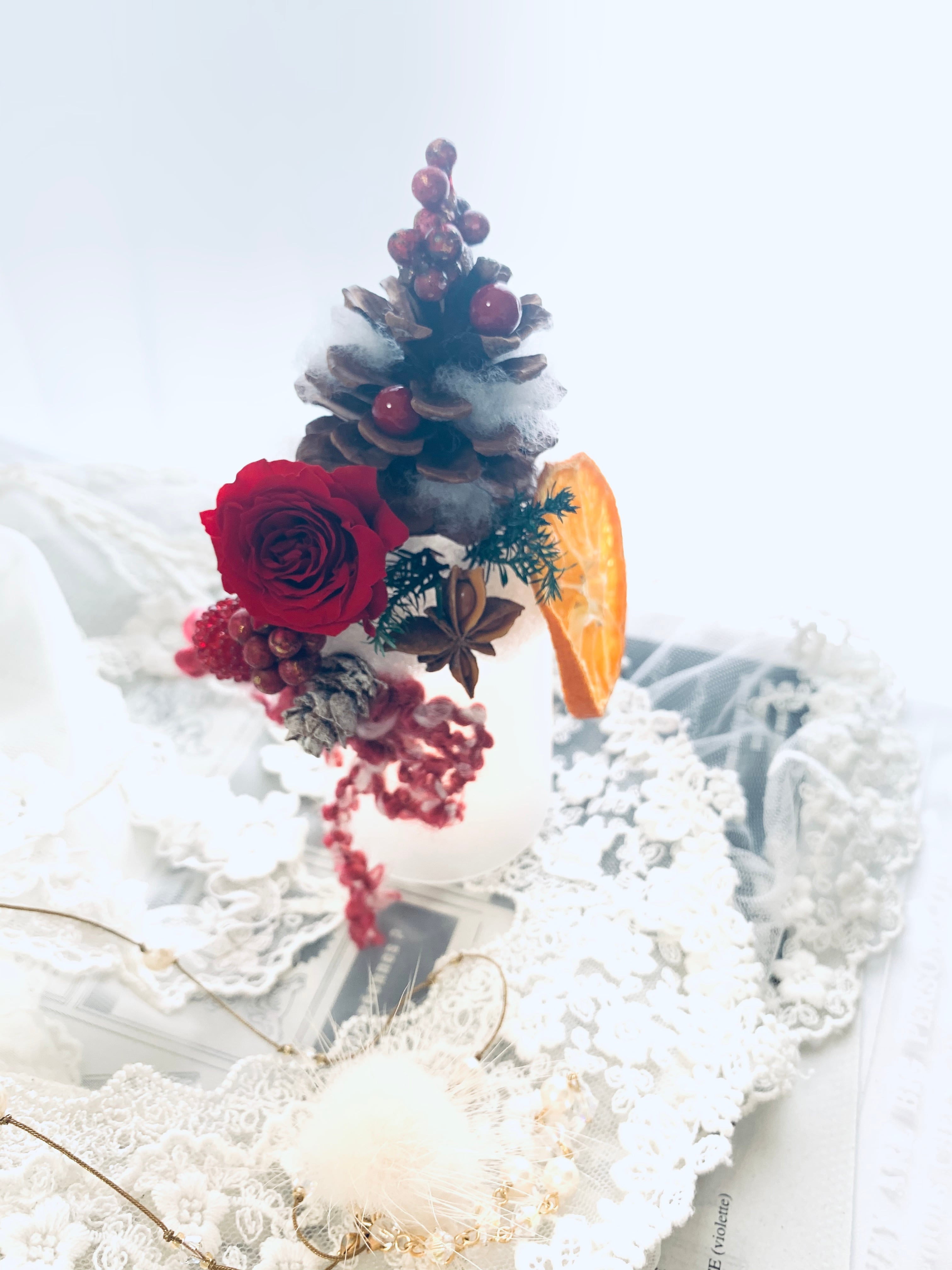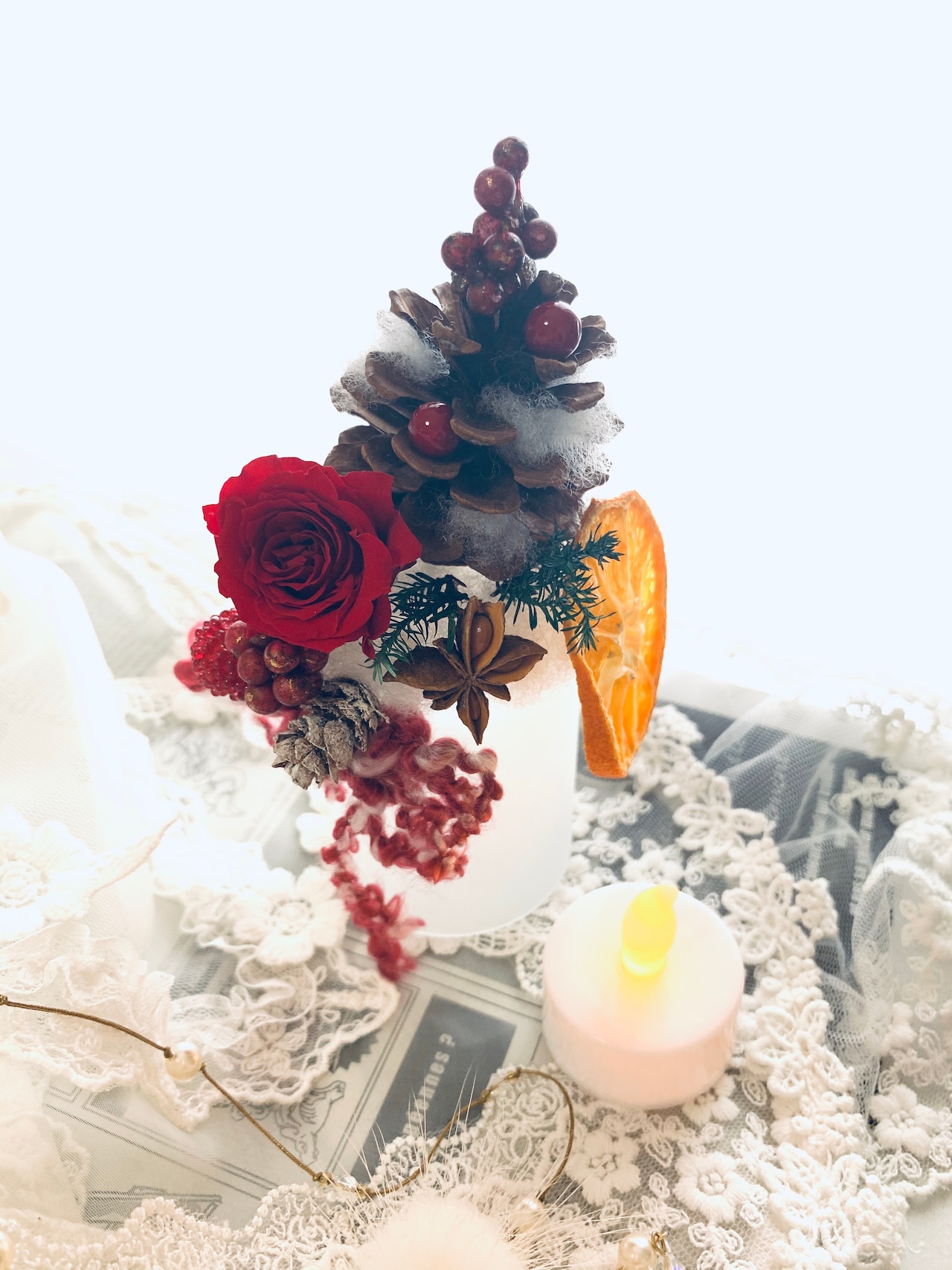 小さなキャンドルが灯るクリスマスアレンジ