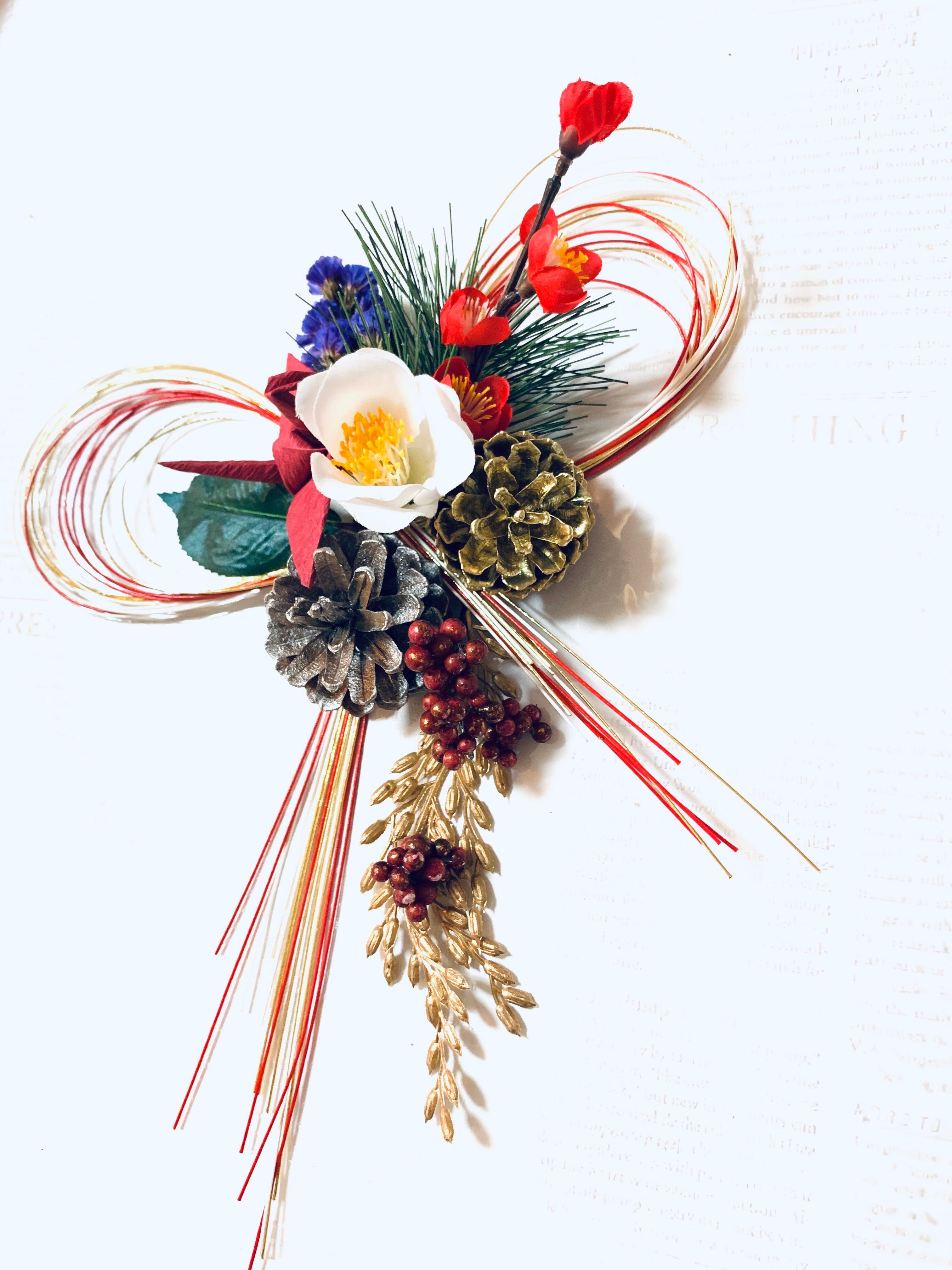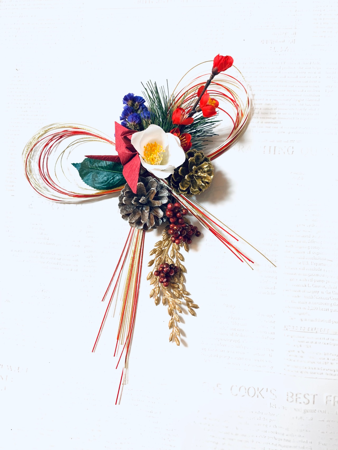 アーティフィシャルフラワーの椿と梅を使用した小振りなオリジナルしめ縄飾り