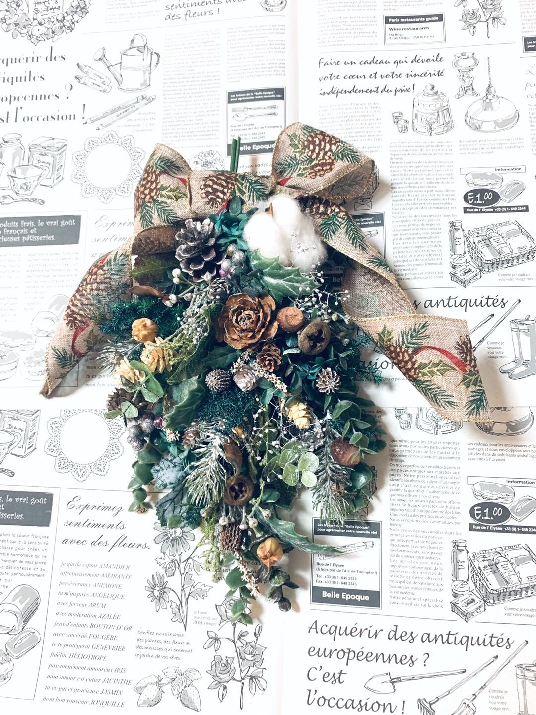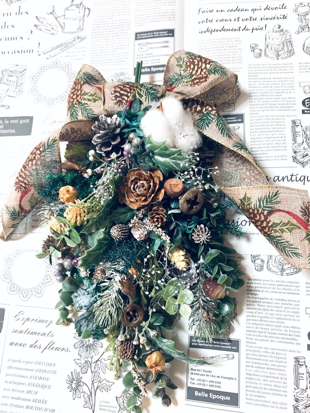 アーティフィシャルフラワーやフェイクの実物やプリザーブドグリーンを使用した森のクリスマススワッグ*゜゜・*:.。..。.:*・ .。.:*・゜゜・*