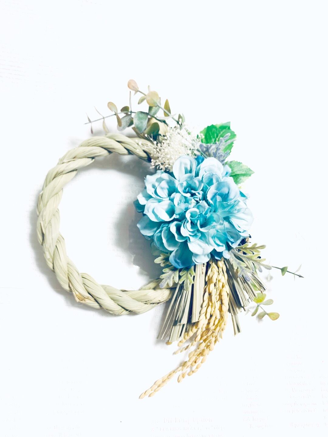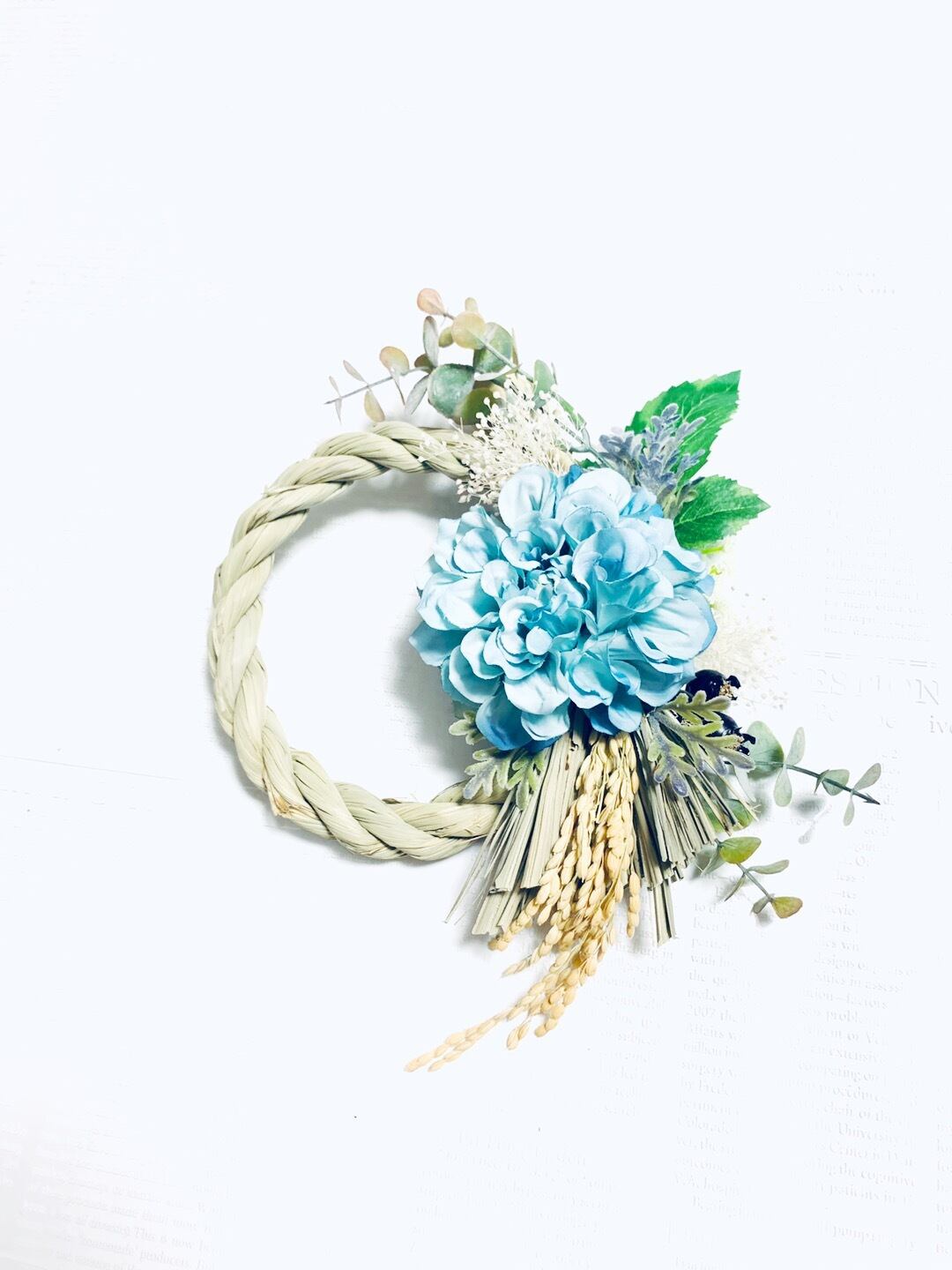 『早割お正月2022』空ブルーのダリア稲穂付き新年を祝うしめ飾り