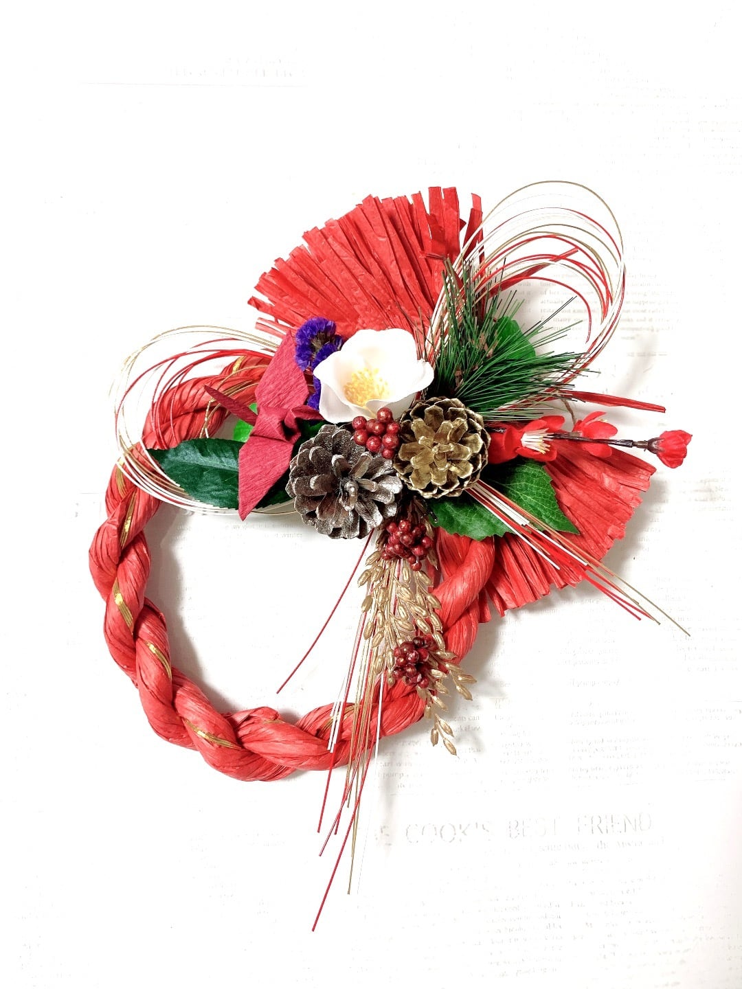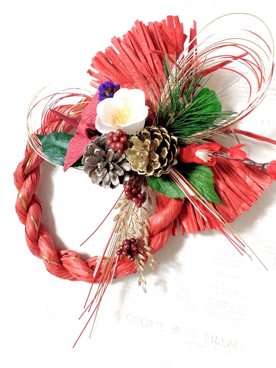 特別価格『早割お正月2022』祝赤しめ縄に寒白椿、梅と松と折鶴の祝正月飾り