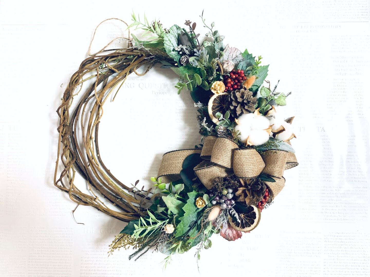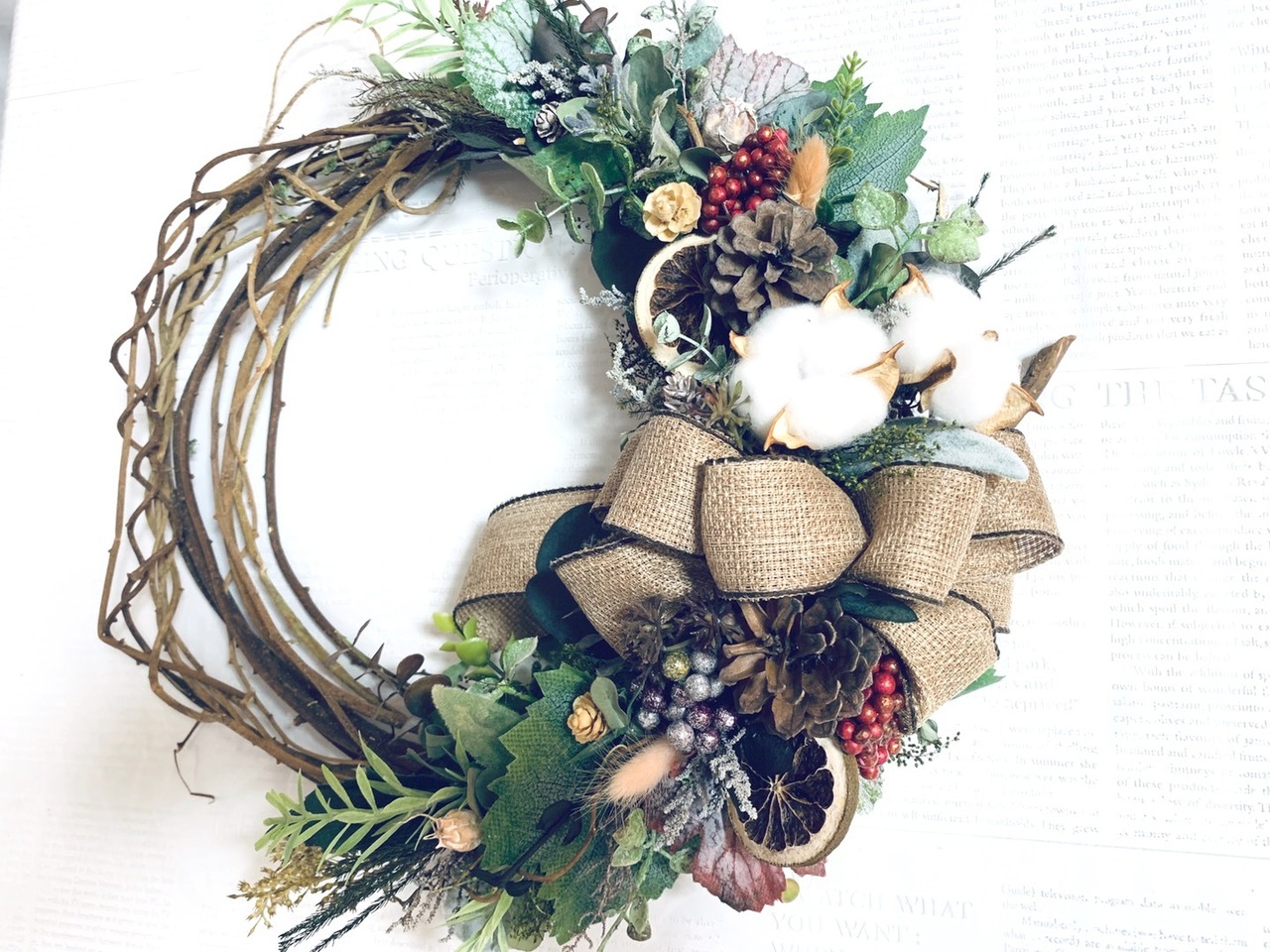 高級アーティフィシャルフラワーとプリザーブドフラワー、ドライフラワーをミックスしながら癒しの空間の彩りに少し大人のクリスマスリースをデザインしました。
