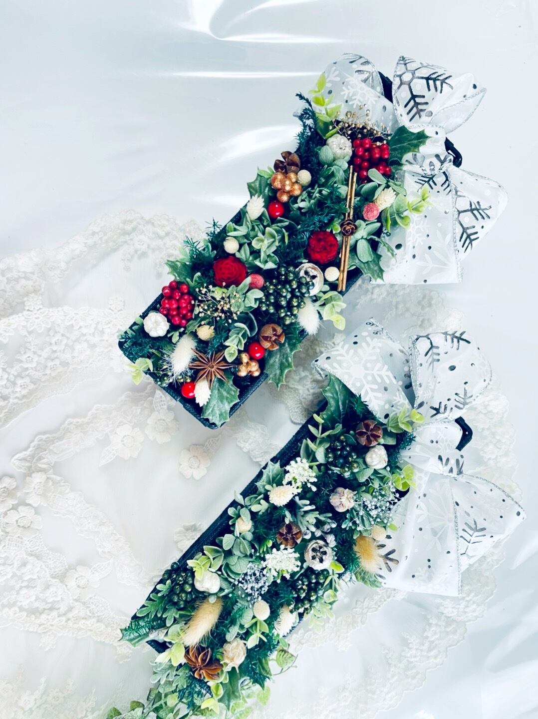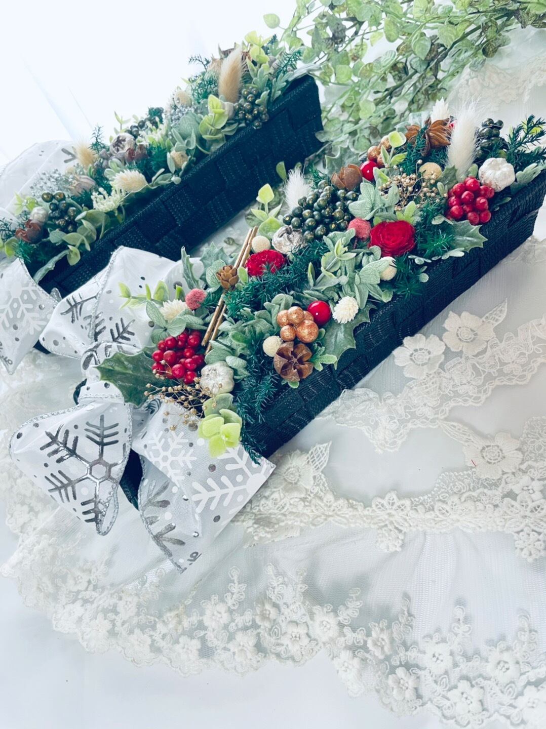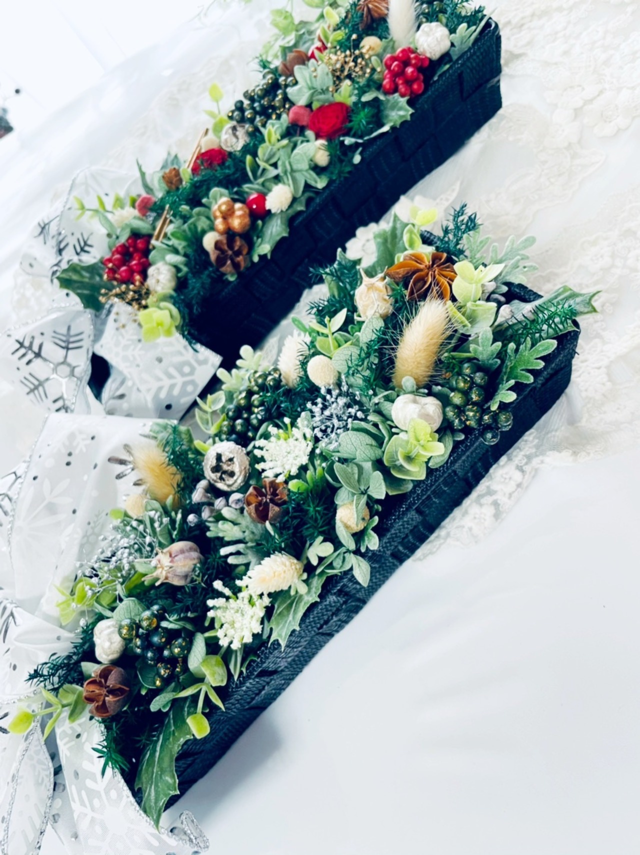 アーティフィシャルフラワーやフェイクの実物やプリザーブドグリーンを使用した森のクリスマスアレンジ゜゜・*:.。..。.:*・ .。.:*・゜゜・*