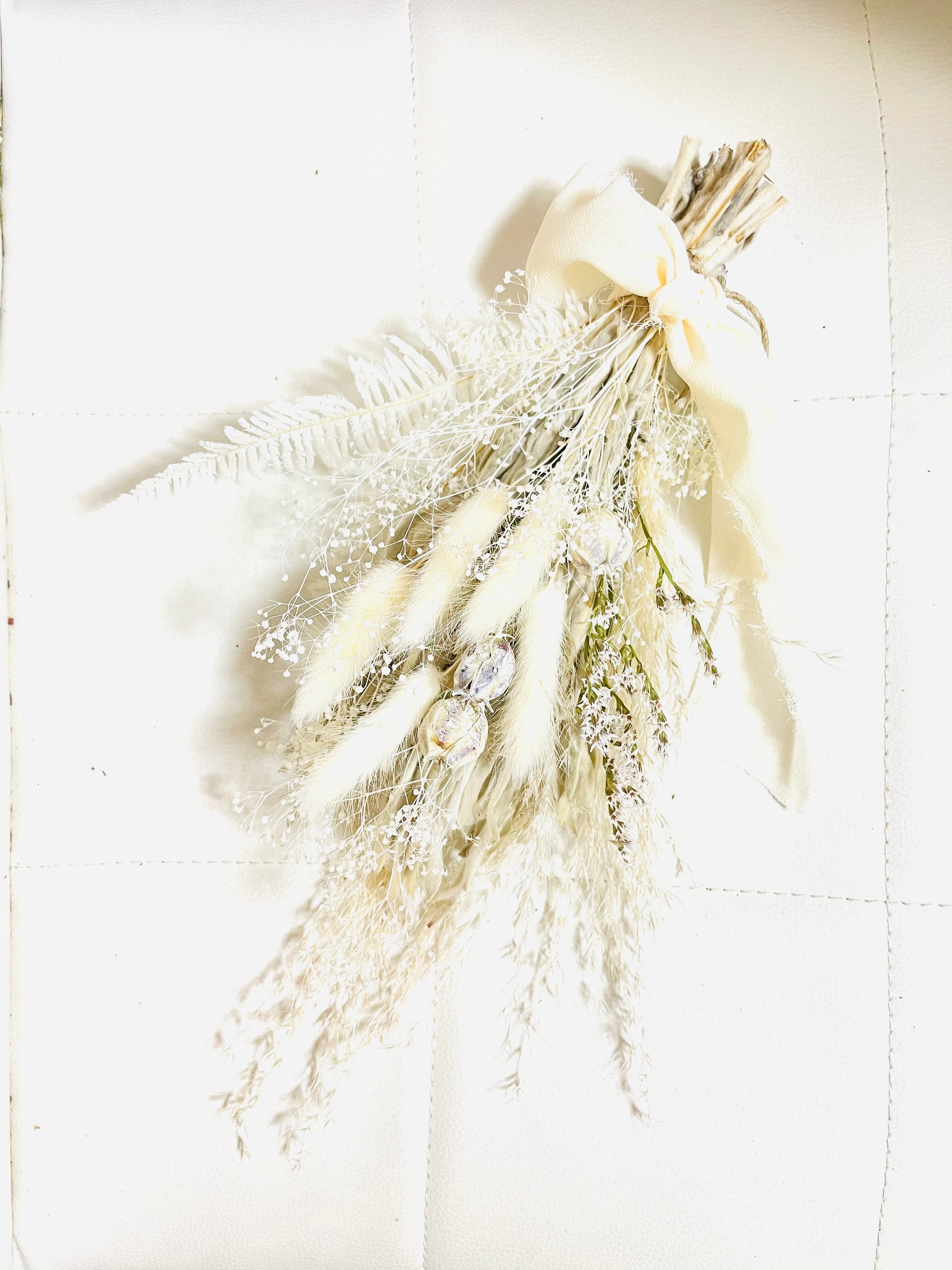 ふわふわな可愛らしいプリザーブドフラワーラグラスやドライフラワーのパンパスグラスなど白い花材をナチュラルに束ね流行りのおリボンで結んだ癒しスワッグをデザインしました*゜゜・*:.。..。.:*・ .。.:*・゜゜・*