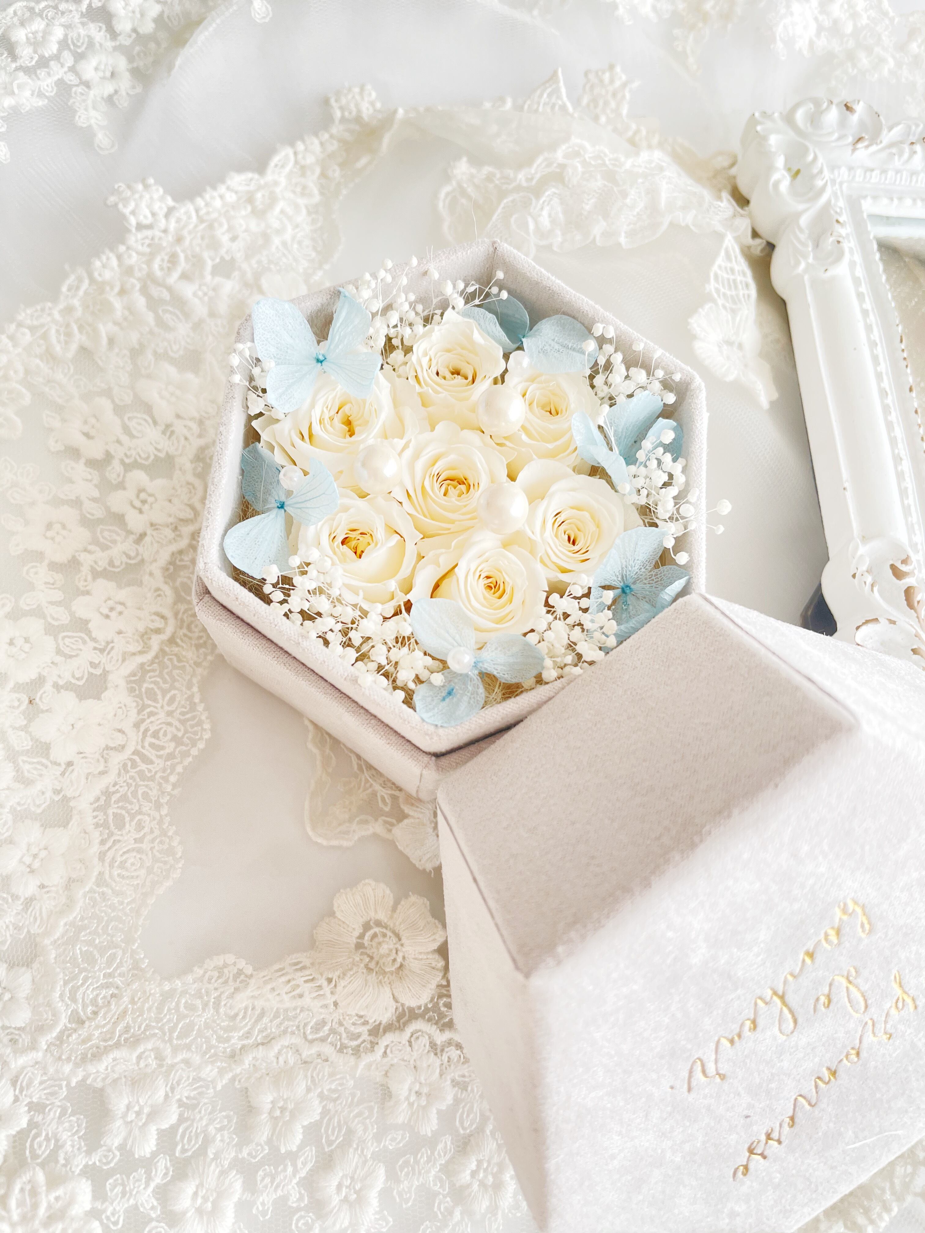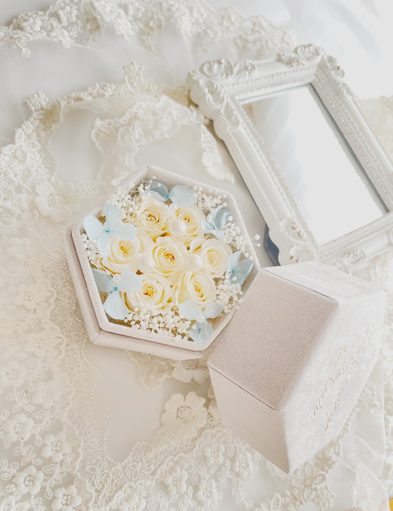 六角形が規則正しく並んだ構造は「ハニカム構造」と呼ばれ、最も安定した力を発揮する幸せなBoxに綺麗なプリザーブドフラワーシャンパンローズSサイズを7輪をバランス良く詰めてかすみ草、紫陽花、パールを添えて花摘みアレンジギフトに。