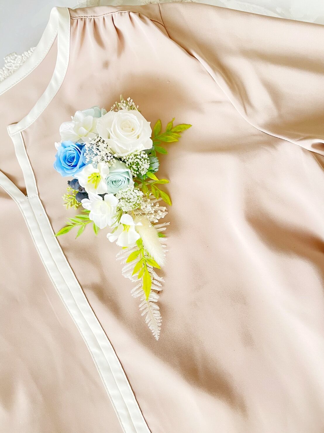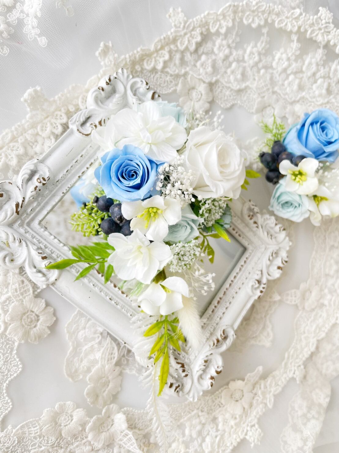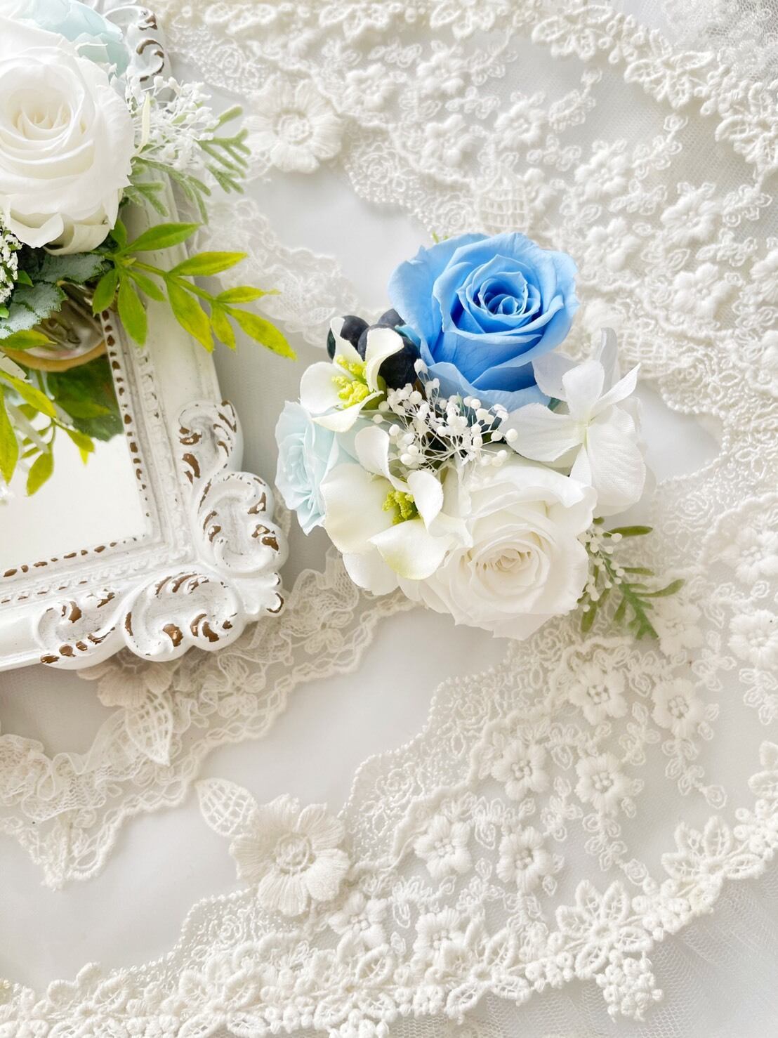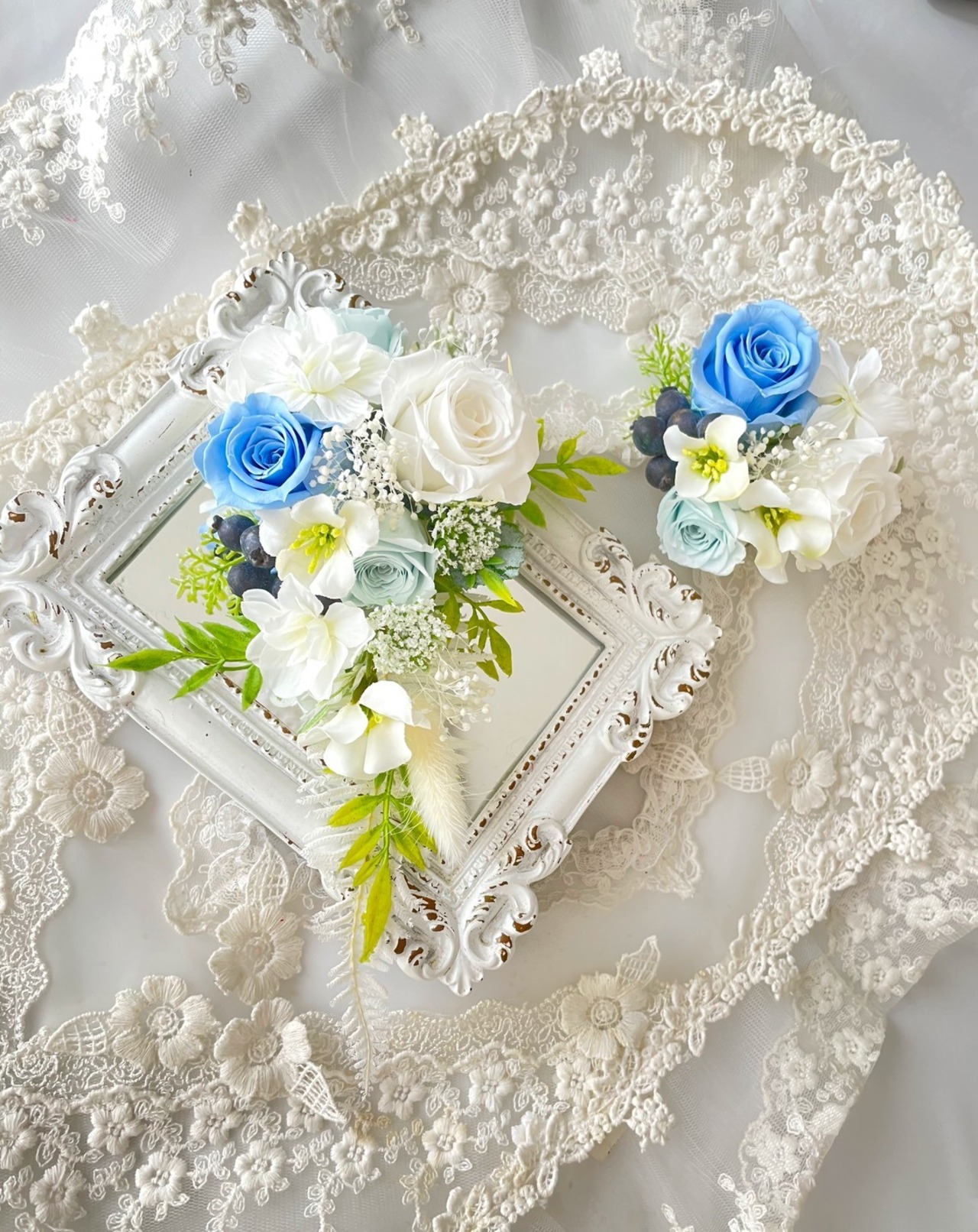 卒業*入学*結婚式*爽やかなブループリザーブドフラワー親子セットコサージュ&髪飾り2way