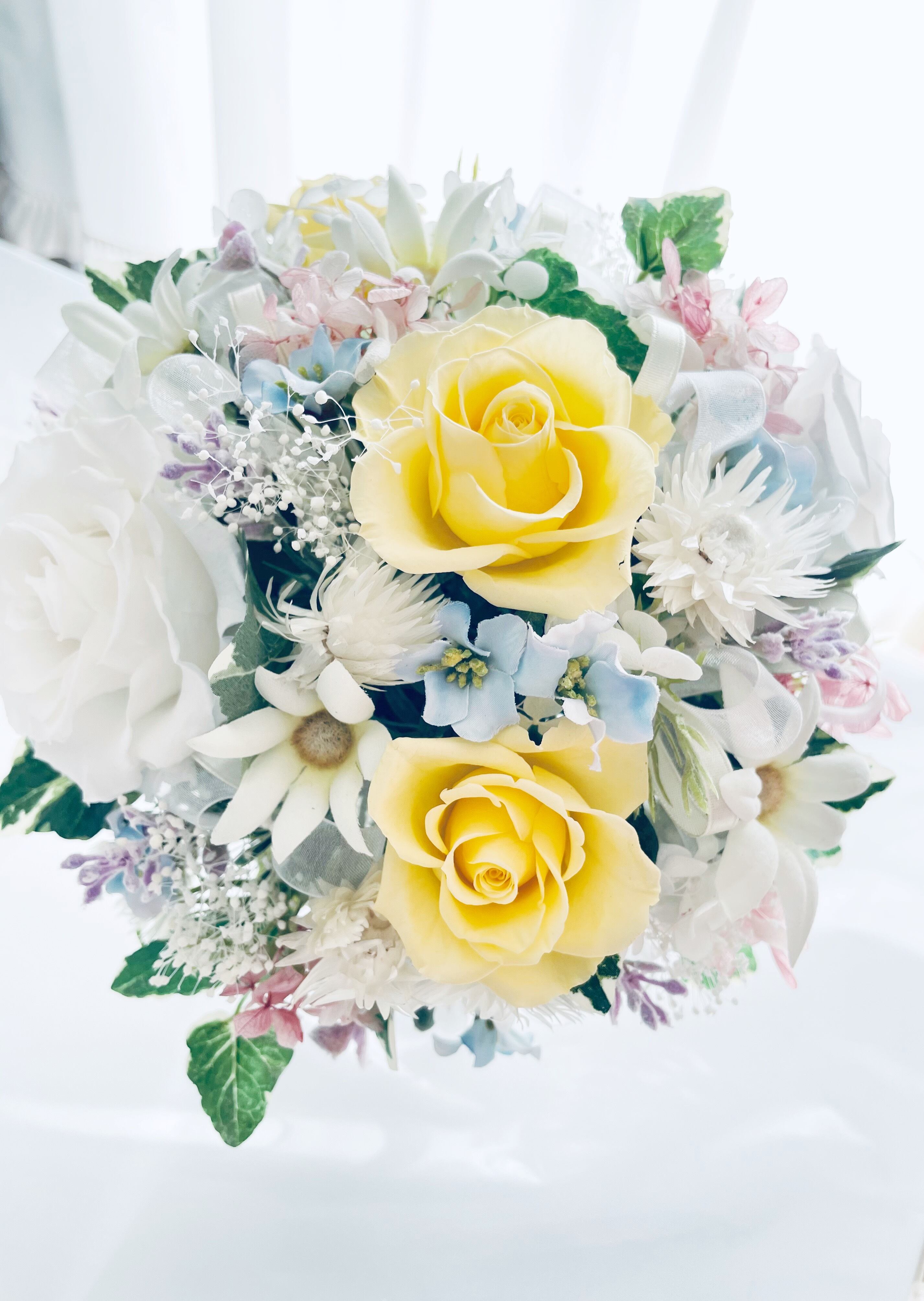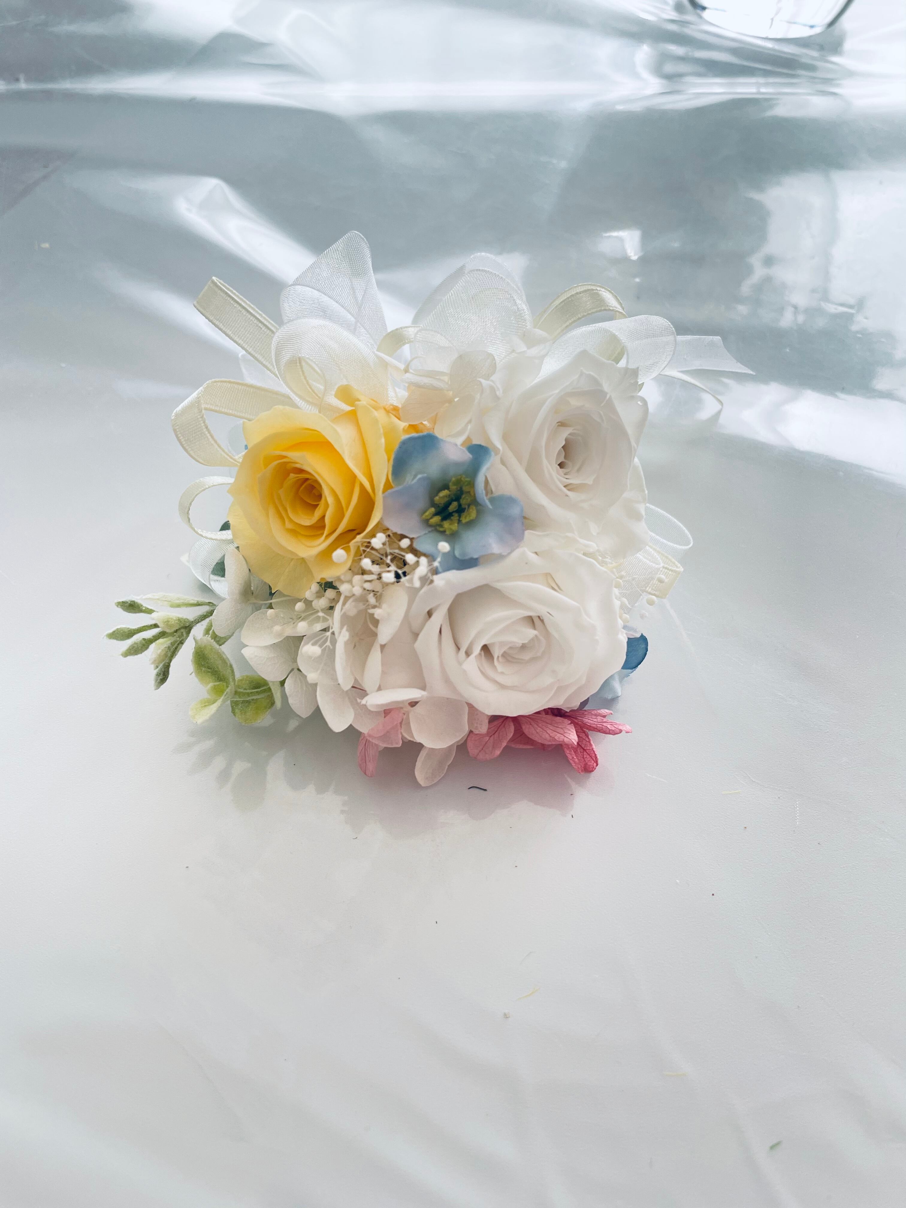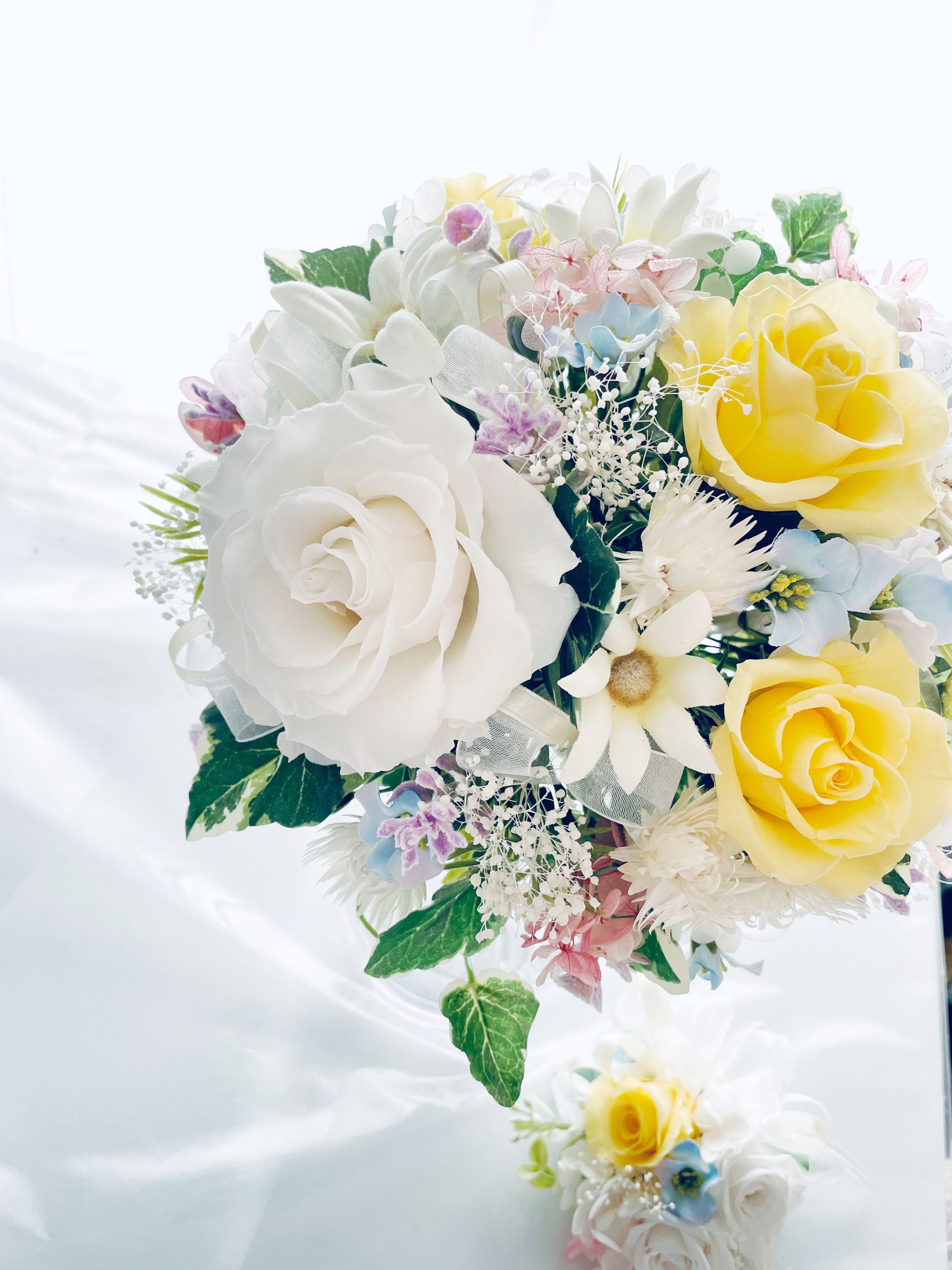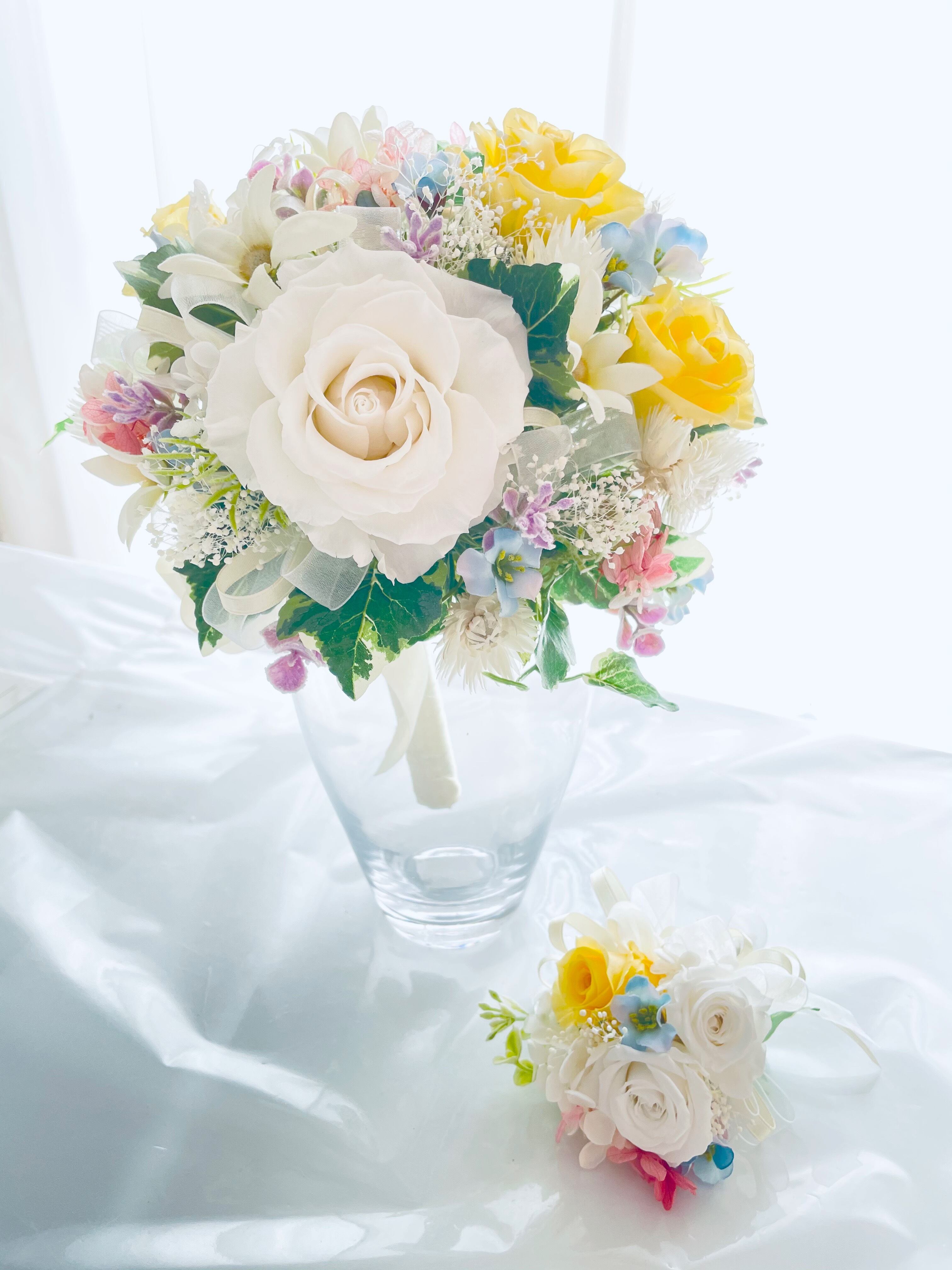 幸せの春カラーパステルのプリザーブドフラワーブーケ*ブートニア付き*お部屋にも飾れるルームフラワー