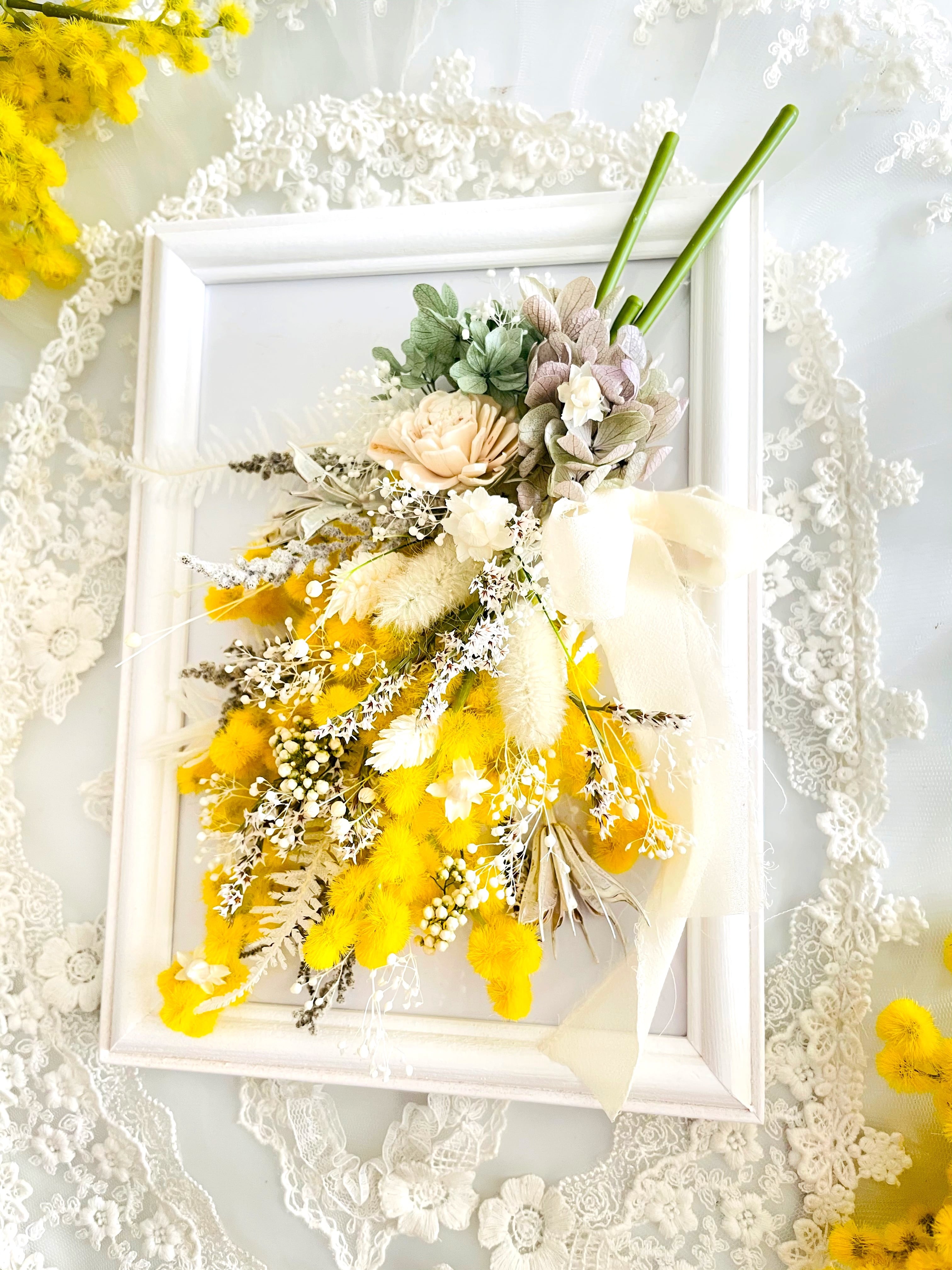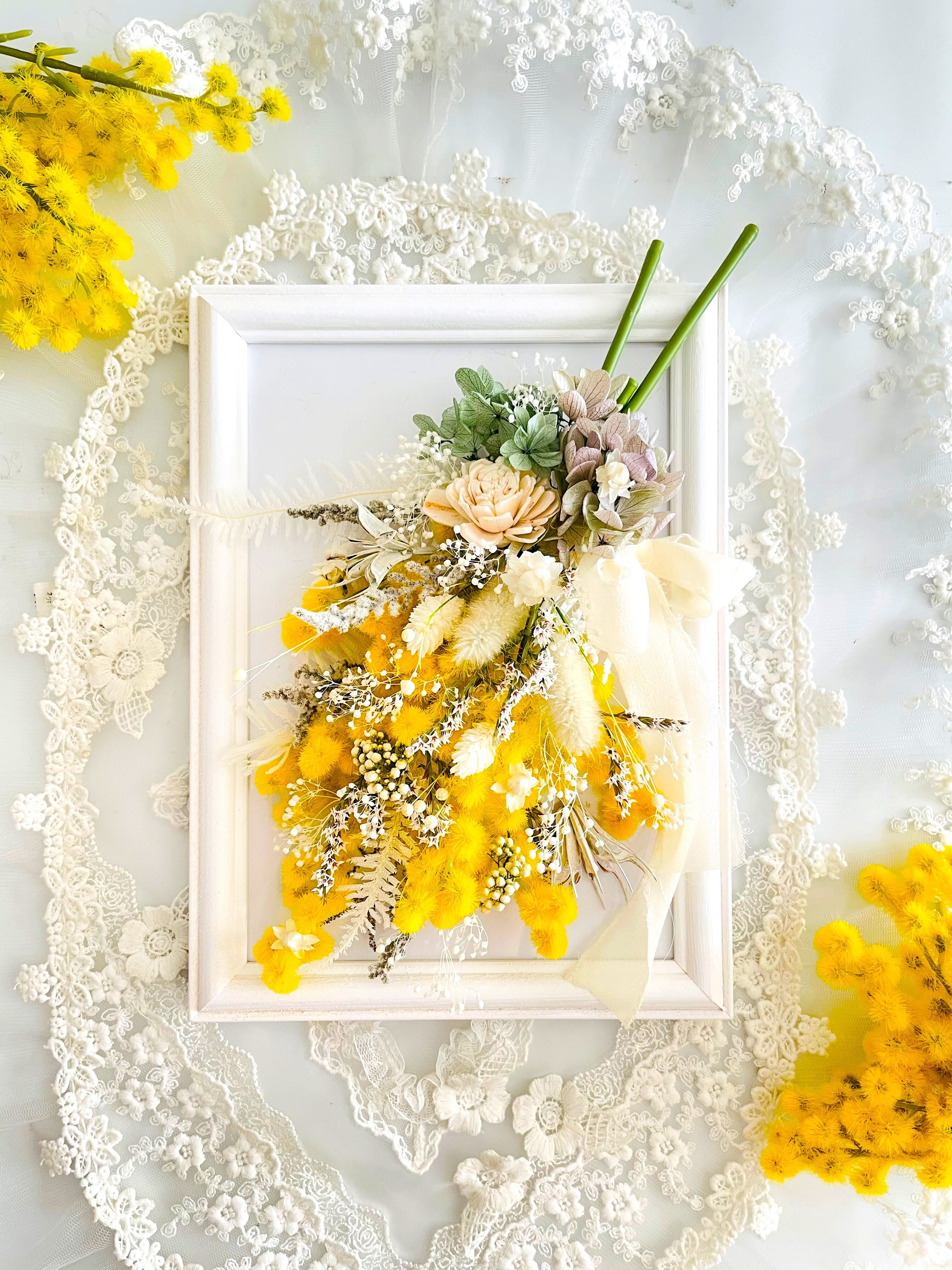 ずっと枯れない綺麗なアーティフィシャルフラワーミモザやふわふわな可愛らしいプリザーブドフラワーラグラスやかすみ草やリンフラワーなどナチュラルな花材を流行りのおリボンで結んだ癒しスワッグフレームをデザインしました*゜゜・*:.。..。.:*・ .。.:*・゜゜・*