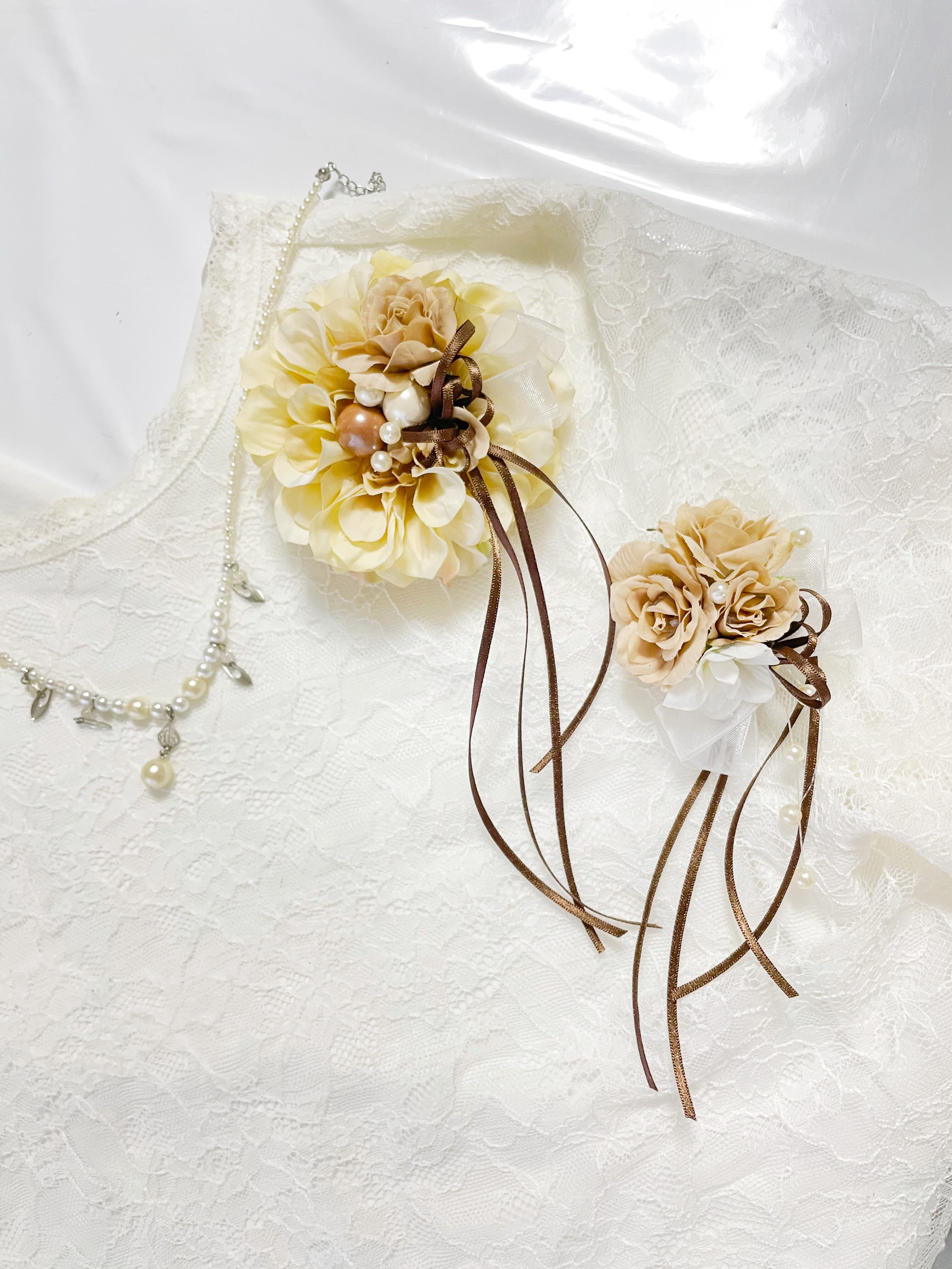 卒業*入学*結婚式*人気のベージュカラーペア親子セットコサージュ&髪飾り2way