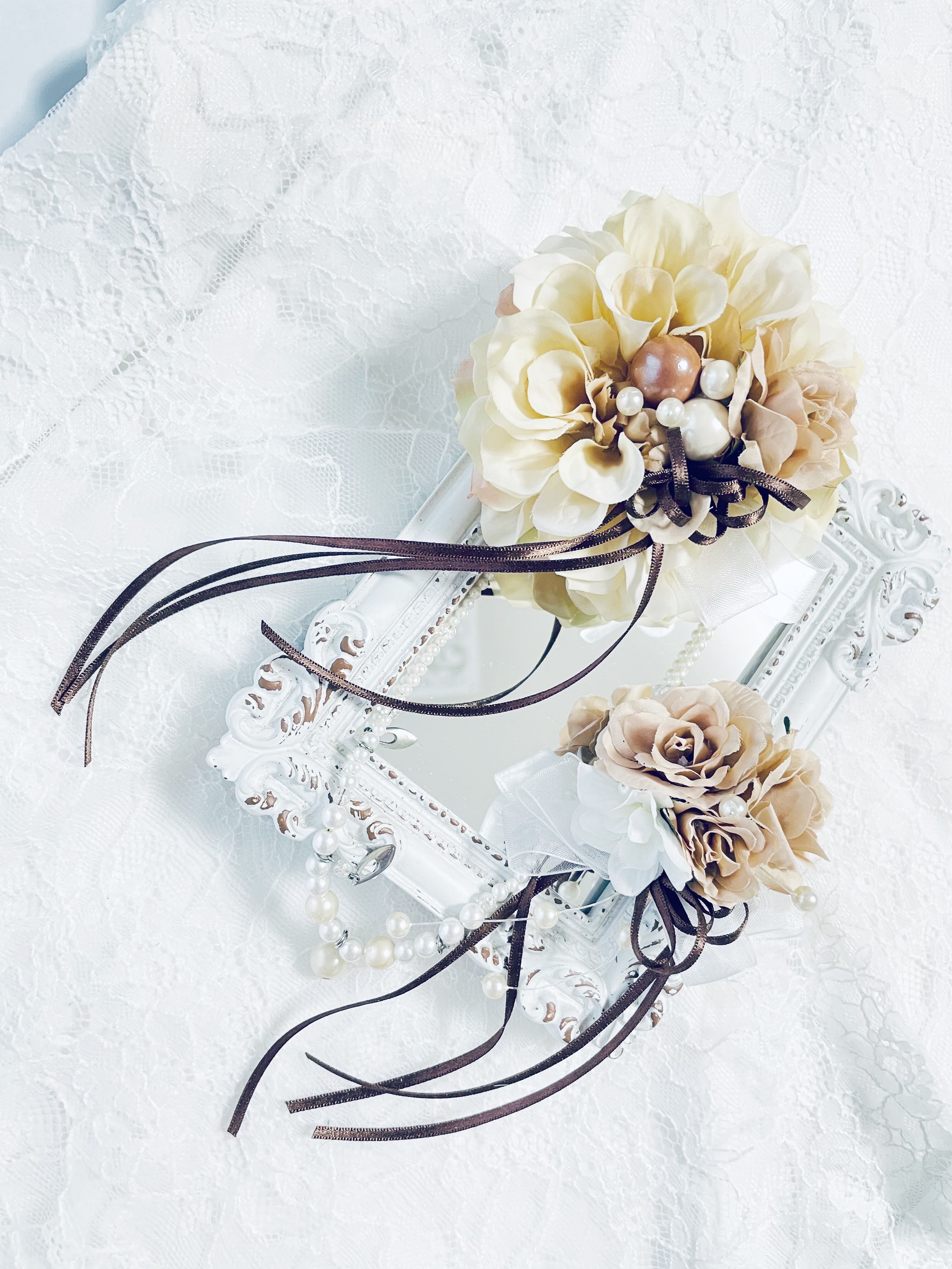 繊細なアーティフィシャルフラワーにパールとリボンを添えて。