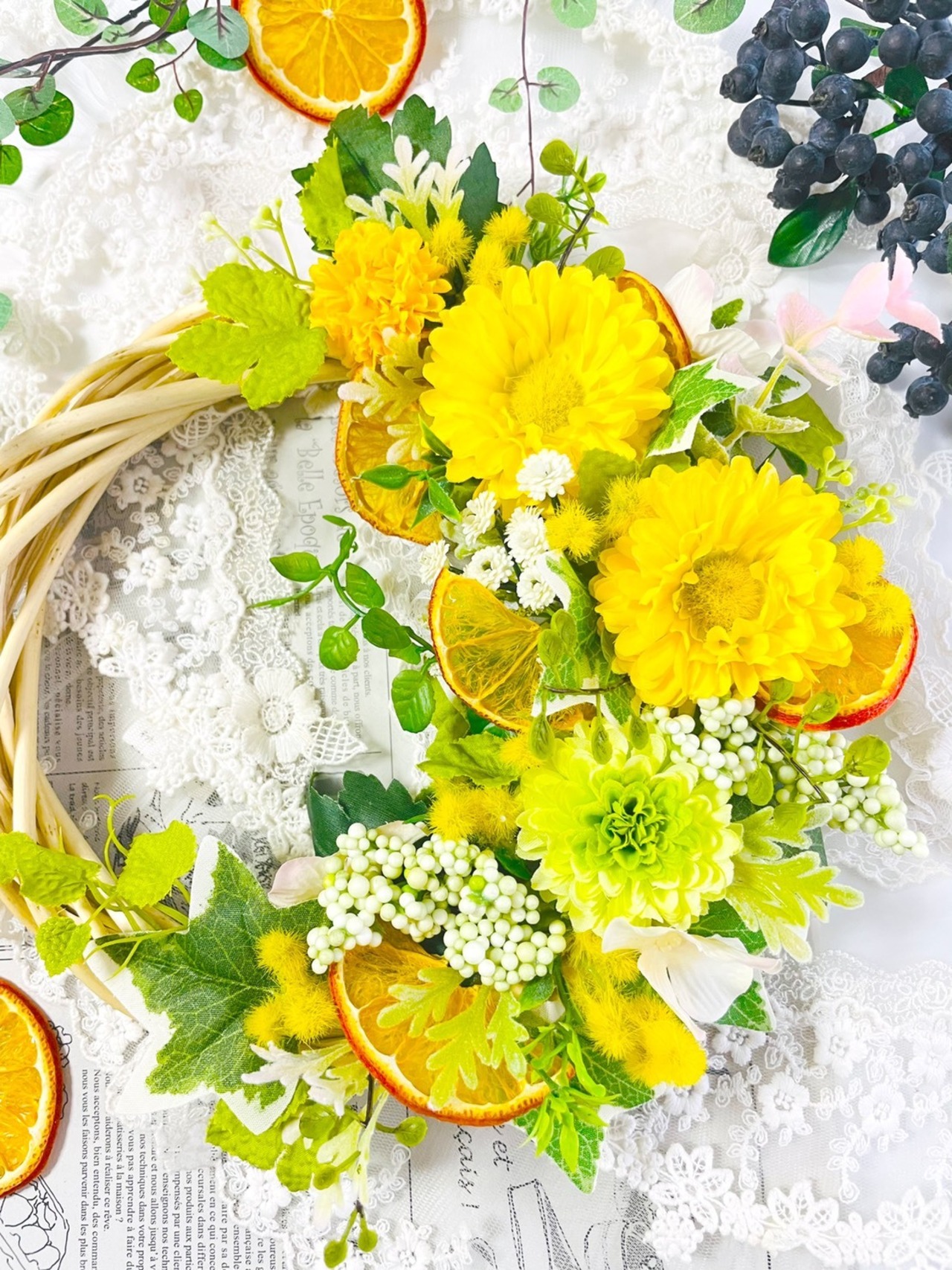 ほんのり香るドライオレンジとアーティフィシャルフラワーを沢山使用しフレッシュで爽やかなリースを作りましょう。
