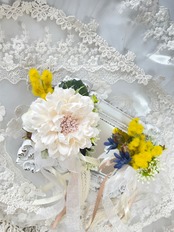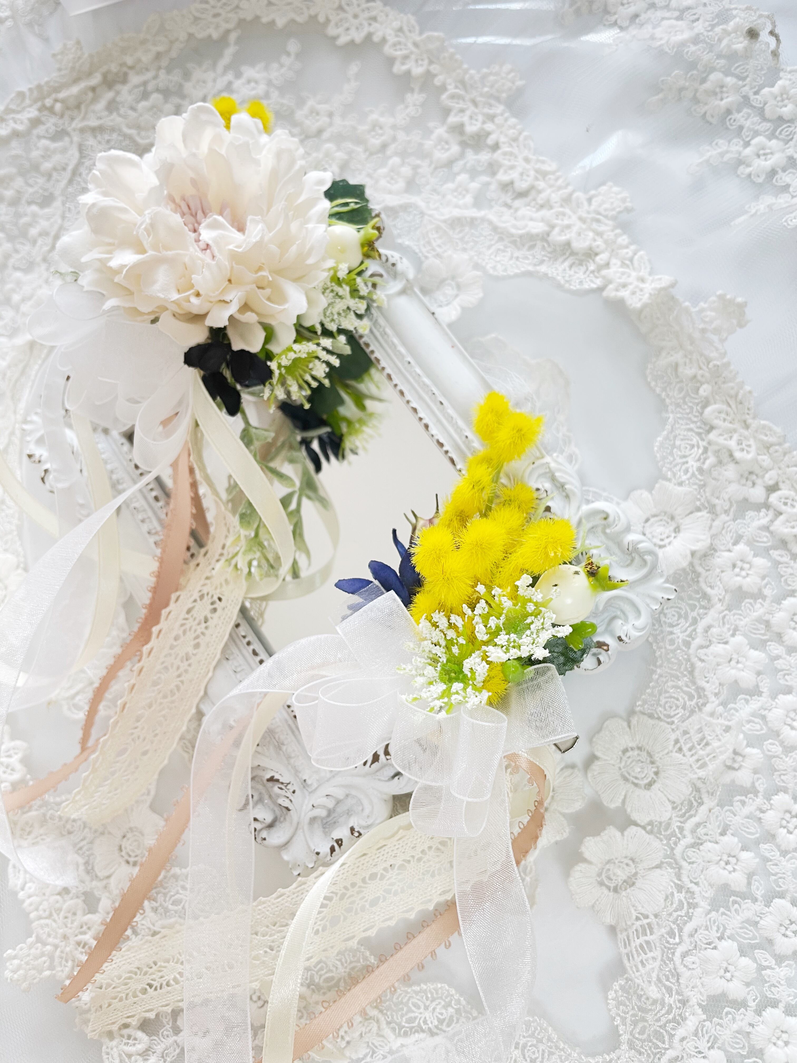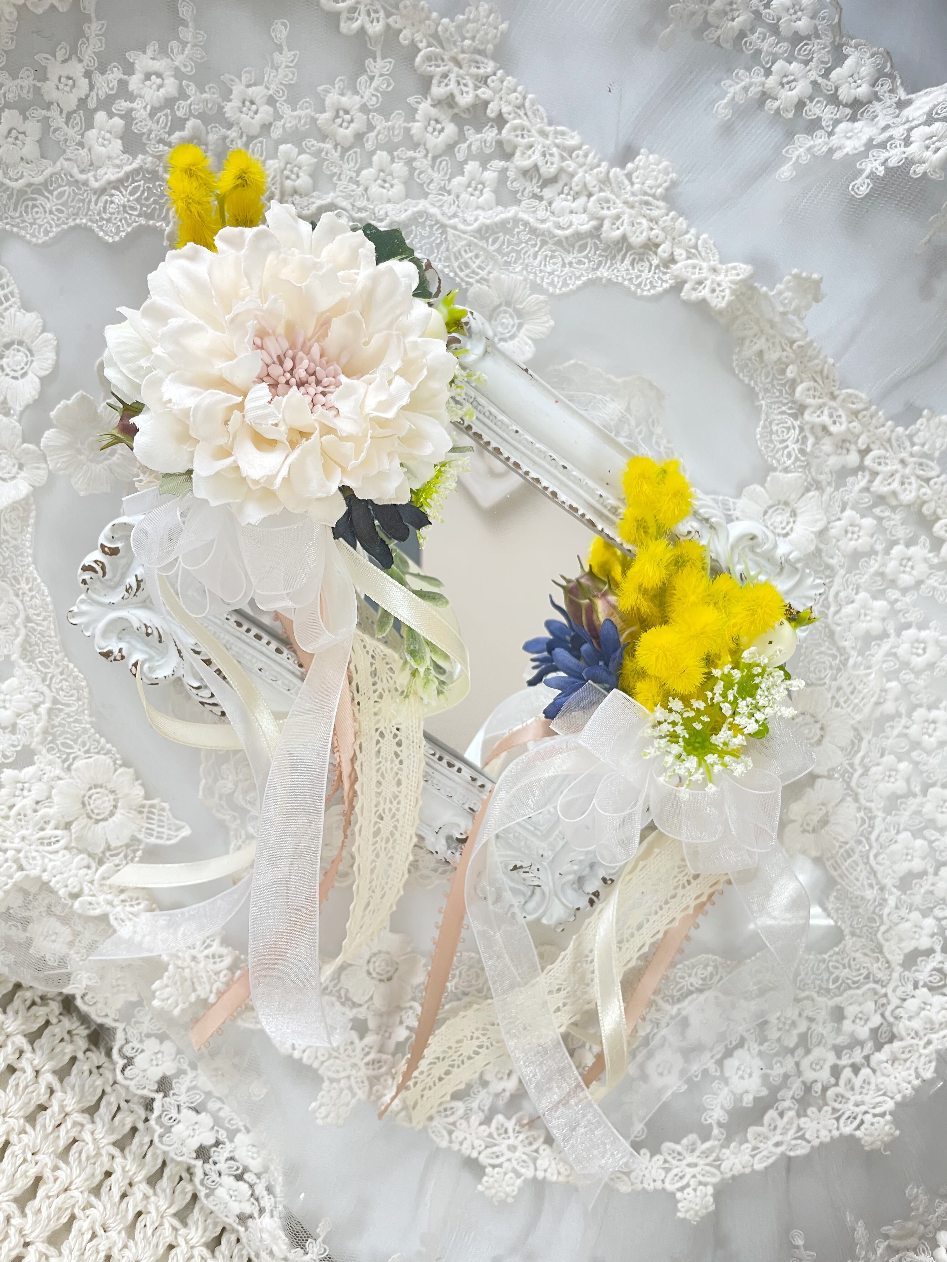 新作は高級なオフホワイトの可愛いアーティフィシャルフラワーと人気のミモザの親子コサージュ