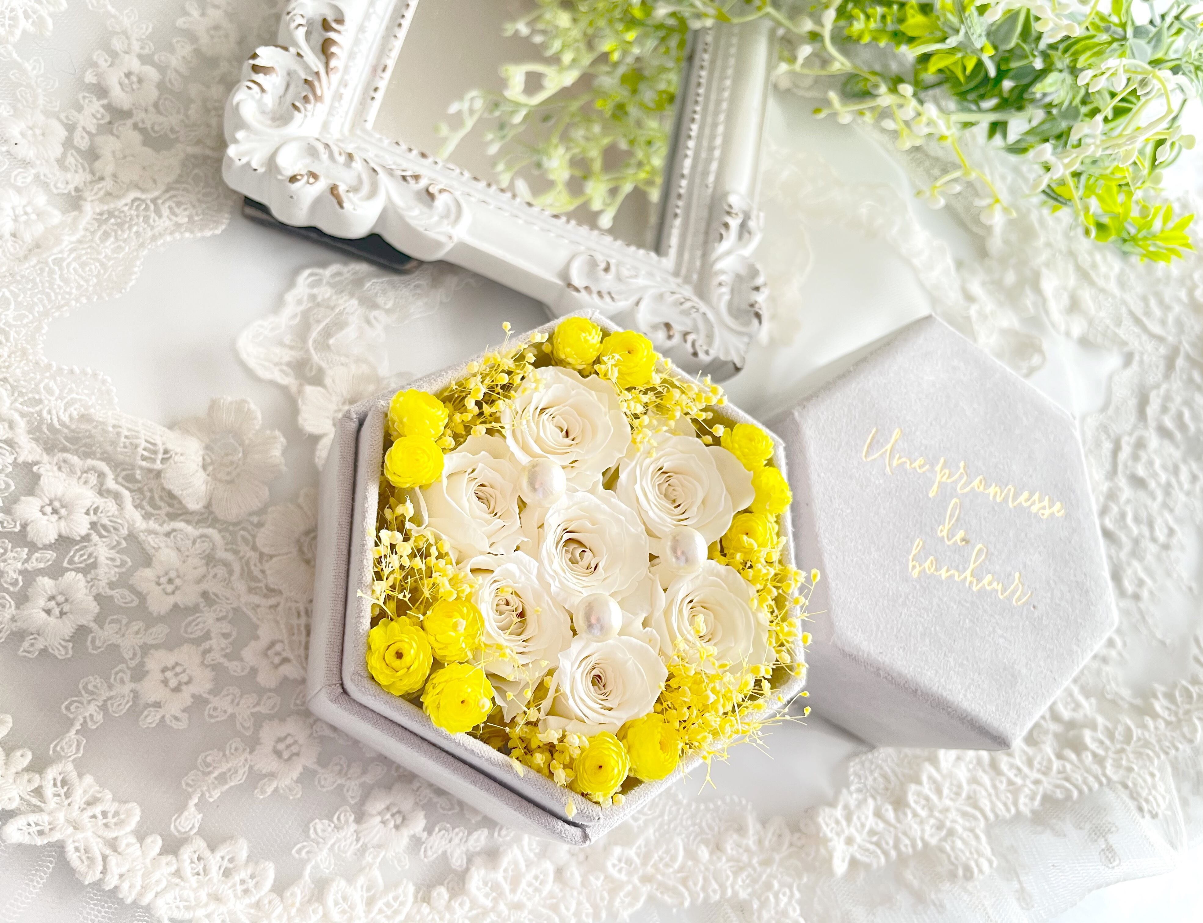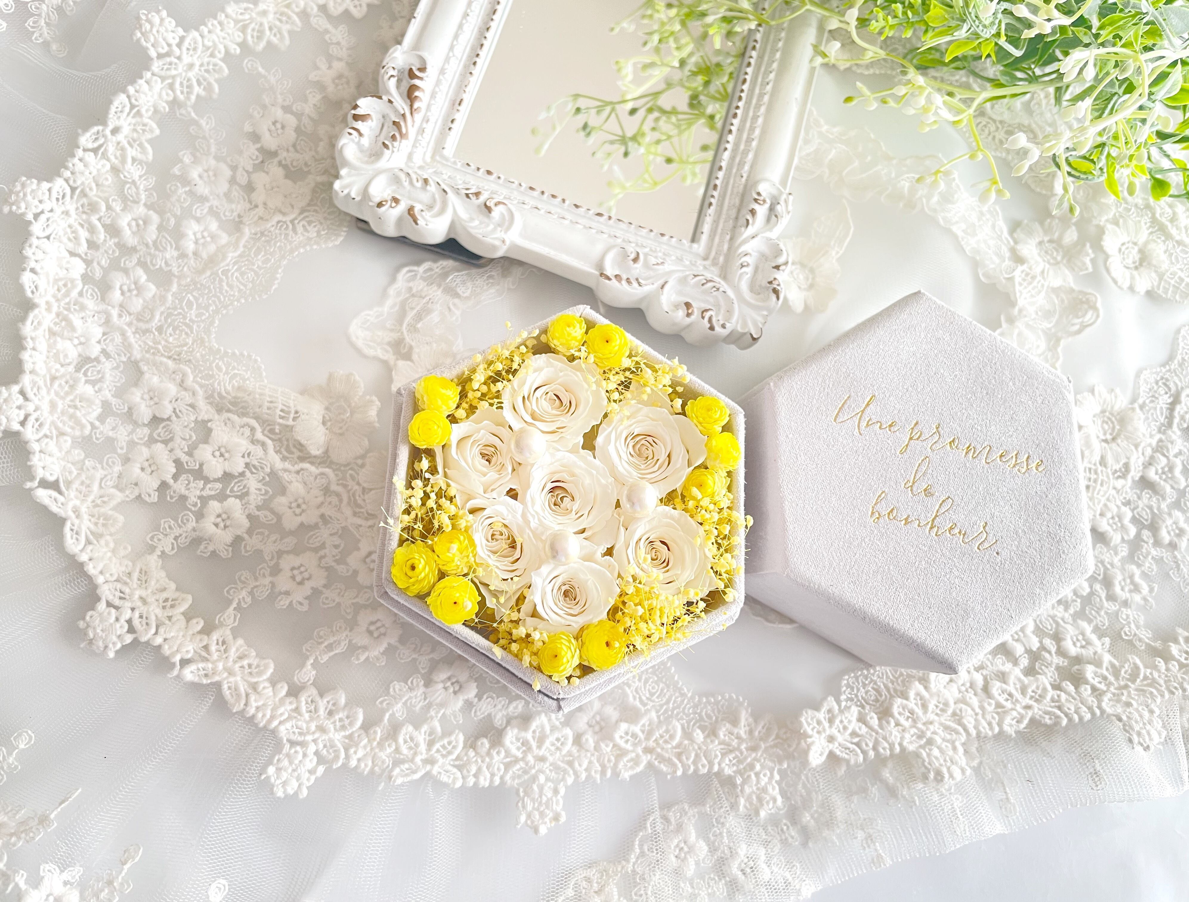 可愛いミモザイエローで母の日ギフト*結婚式エンゲージカバーセレモニー*リングピロー*シャンパンホワイトプリザーブドフラワーBox